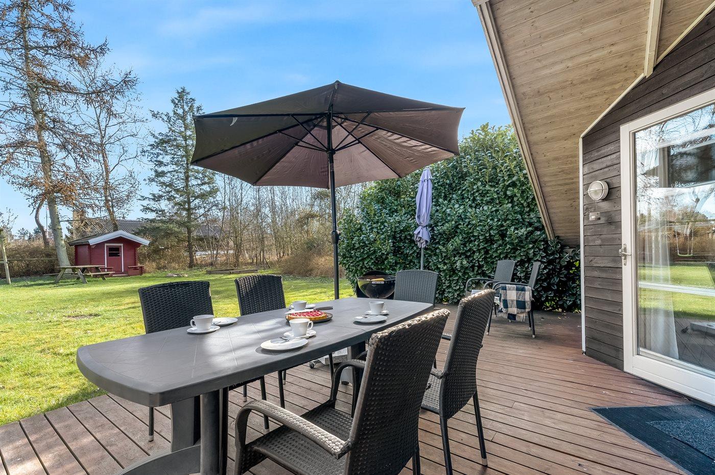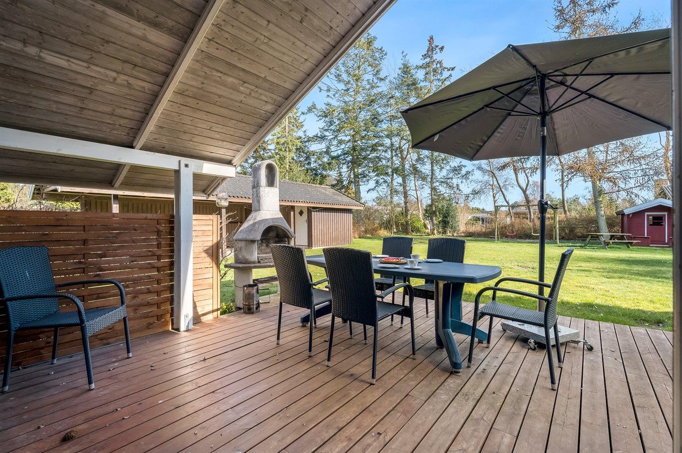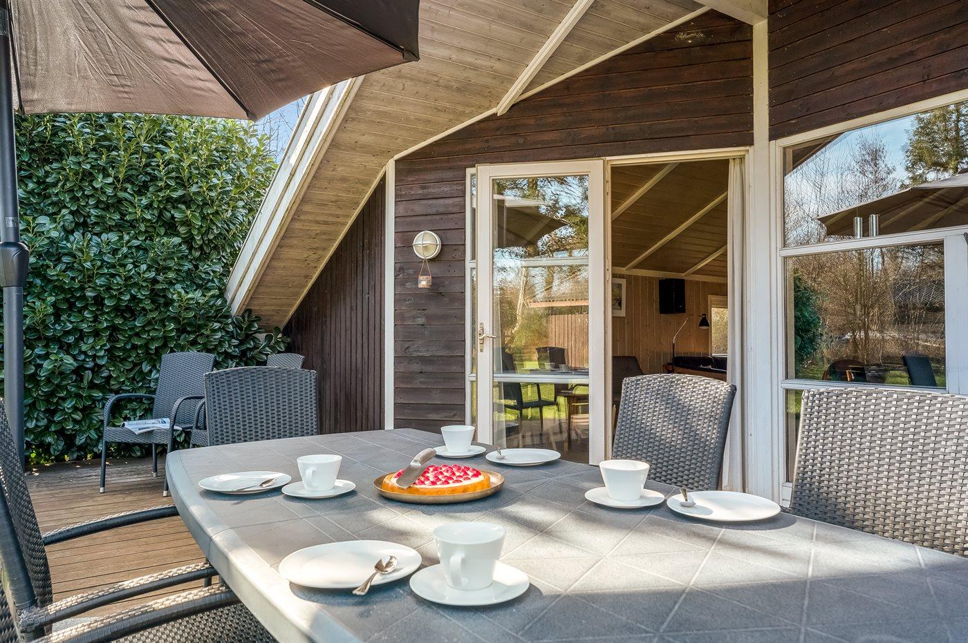 Ein wirklich schönes Ferienhaus aus Holz mit sowohl offenen als auch überdachten Terrassenbereichen mit Gartenmöbeln auf der herrlichen, südlich ausgerichteten Terrasse. Ein gutes Ferienhaus als Ausgangspunkt für einen wunderbaren Urlaub.