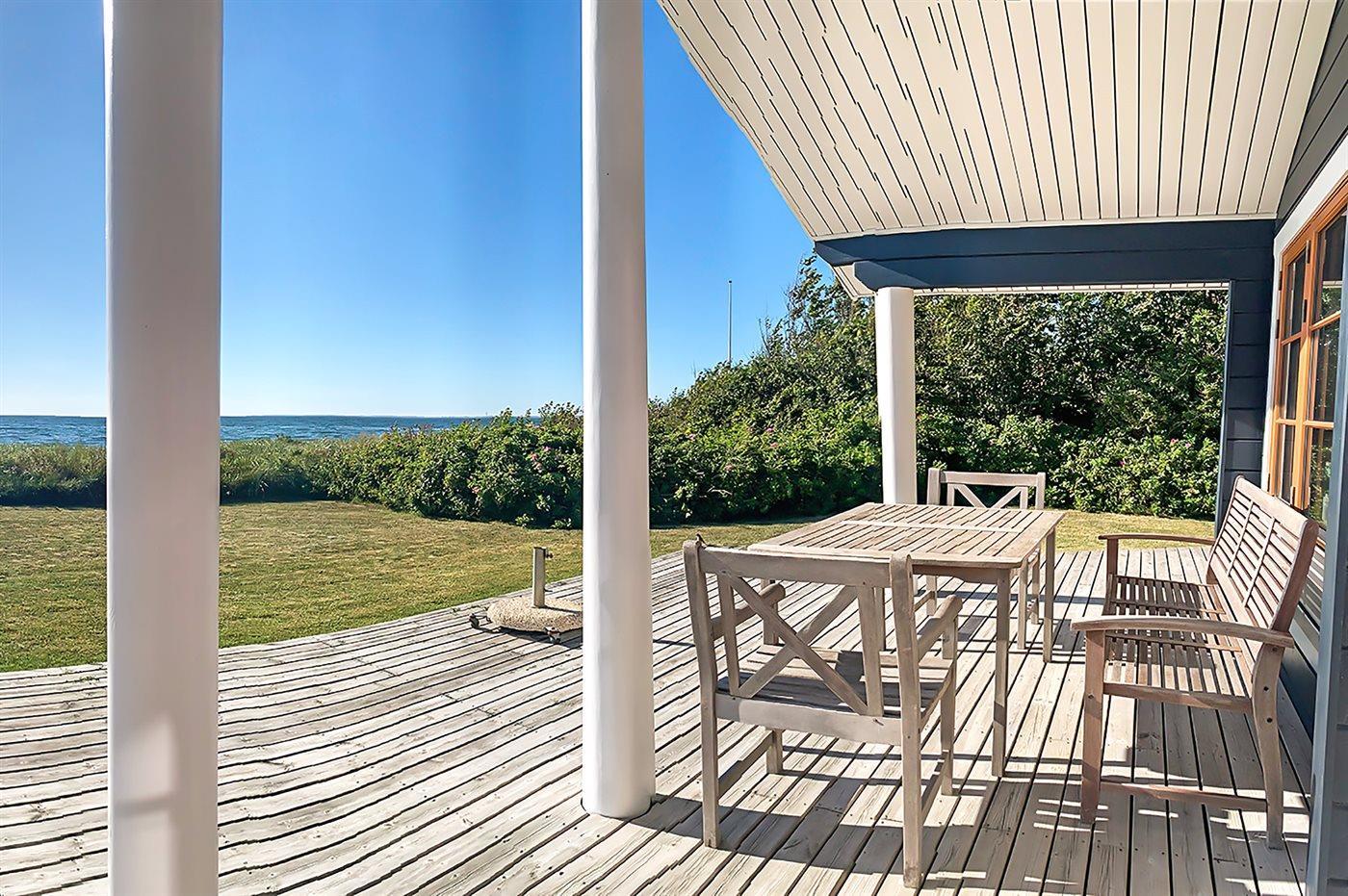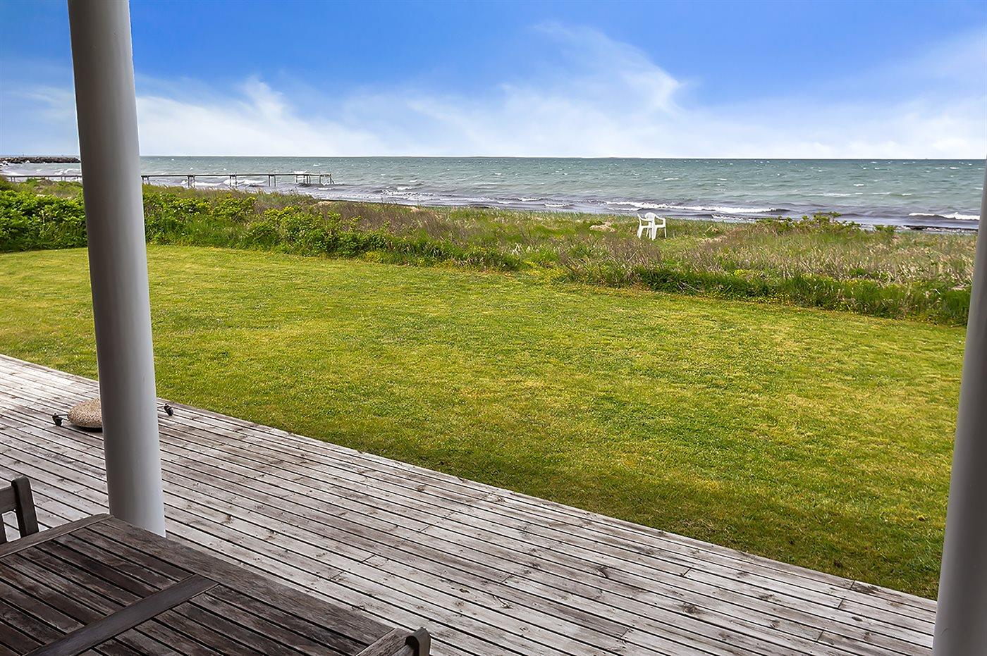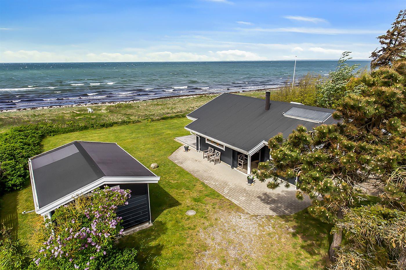 Die Ferienunterkunft liegt auf einem 1204 m² großen Naturgrundstück mit Privatstrand. Bis zum Meer sind es 10 m. Das nächste Geschäft ist 1000 m weit entfernt. Zur Ferienunterkunft gehört ein 50 m² großer, offener Terrassenbereich. Außerdem gibt es eine 20 m² große, überdachte Terrasse und eine Außendusche für den Sommer. Auch ein Weber-Kugelgrill steht zur Verfügung. Parkmöglichkeiten an der Ferienunterkunft.