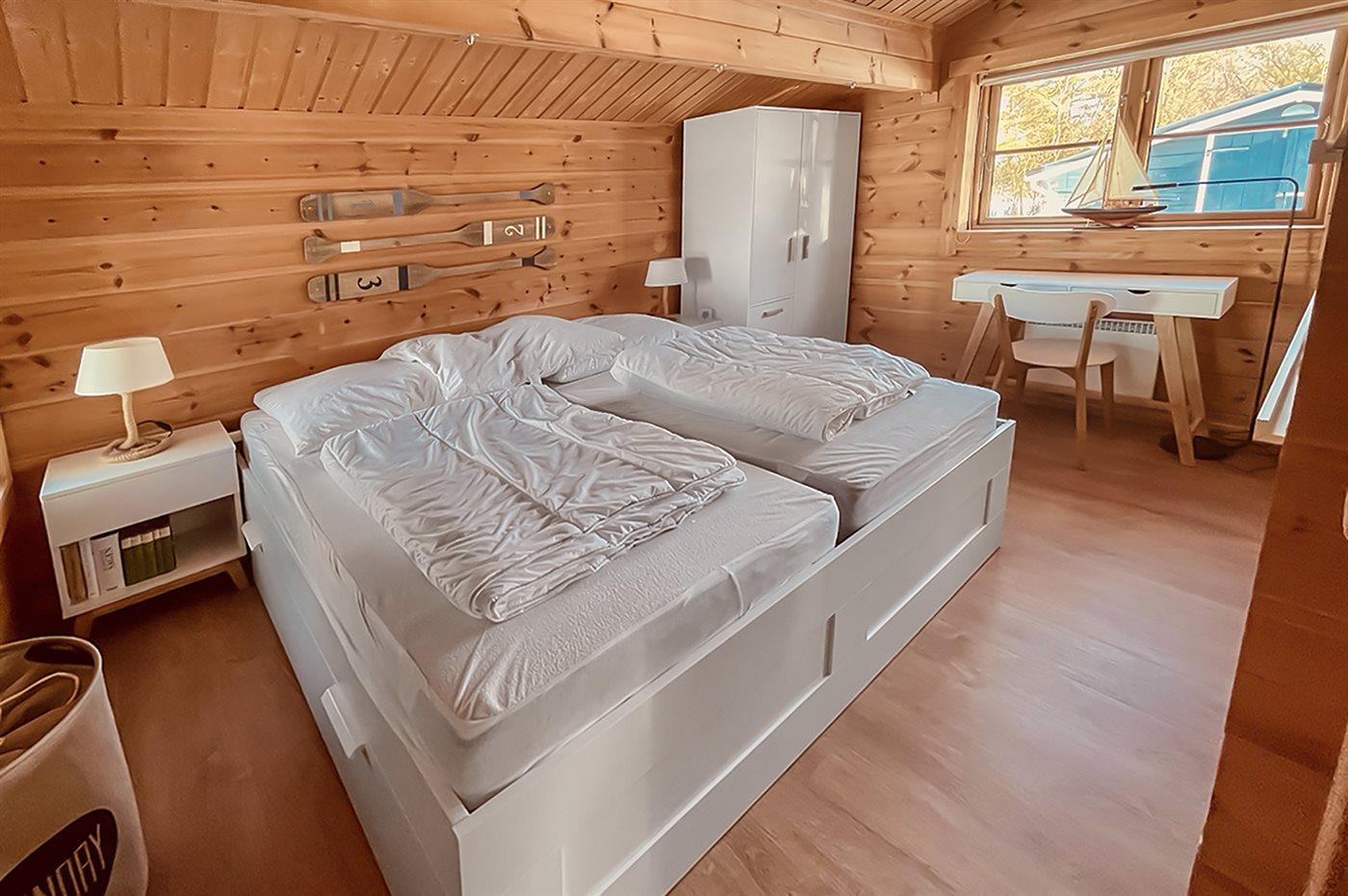 Das Haus ist mit 2 Schlafzimmern ausgestattet, beide mit Doppelbett. Zusätzlich befinden sich im offenen Obergeschoss noch insgesamt 2 weitere Schlafplätze auf Matratzen.