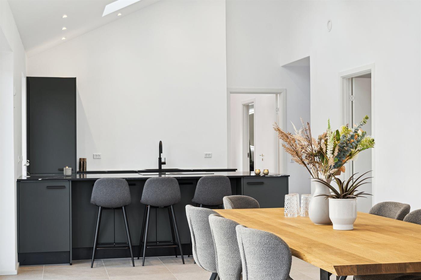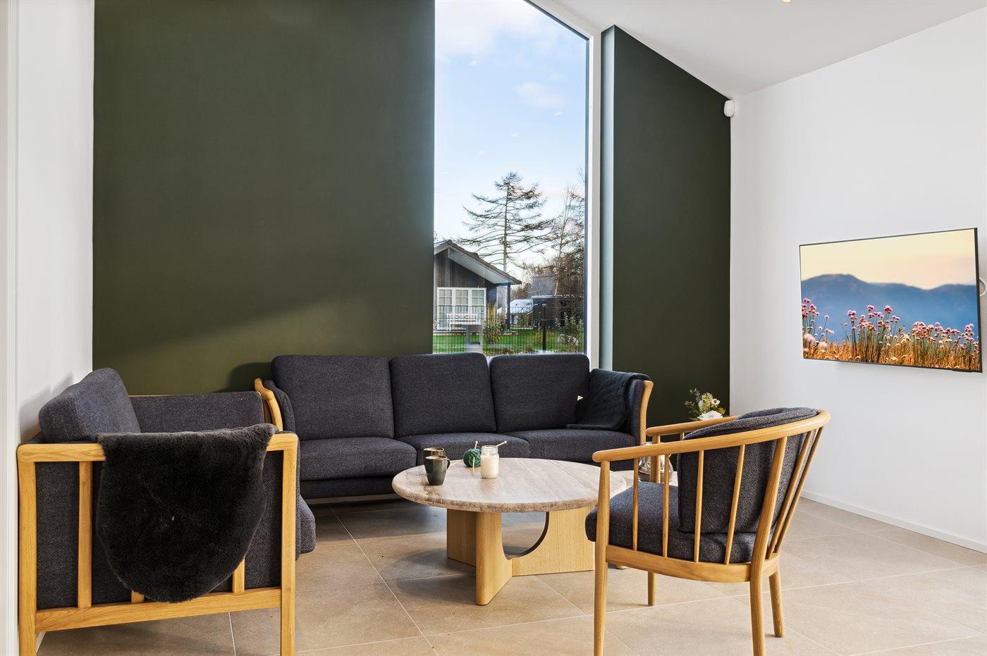 Das Ferienhaus verfügt über einen großen, hellen Küchen-Wohnbereich mit Decken bis zum First und Zugang zur Terrasse mit Gartenmöbeln und Außen-Whirlpool. Es gibt einen Essbereich und eine gemütliche Sofaecke mit Fernseher. Dreii Schlafzimmer sind mit Doppelbetten ausgestattet, und ein weiteres Schlafzimmer hat ein Doppelbett und ein eigenes, besonders schönes Badezimmer. Zusätzlich gibt es ein weiteres Badezimmer im Eingangsbereich. Alles im Ferienhaus ist von bester Qualität und aus hochwertigen Materialien gefertigt. Wellness pur – sowohl drinnen als auch draußen.
