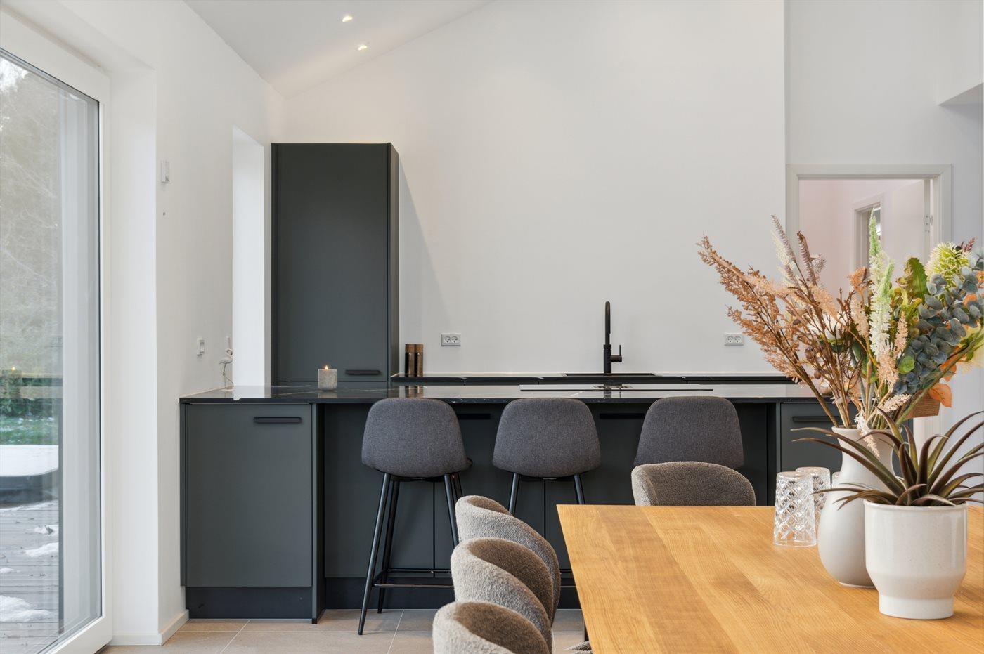 Die Küche ist mit Kühlschrank ausgestattet. Außerdem gibt es 4 Induktions-Kochzonen, Umluftofen, 2 Airfryer sowie Geschirrspüler.