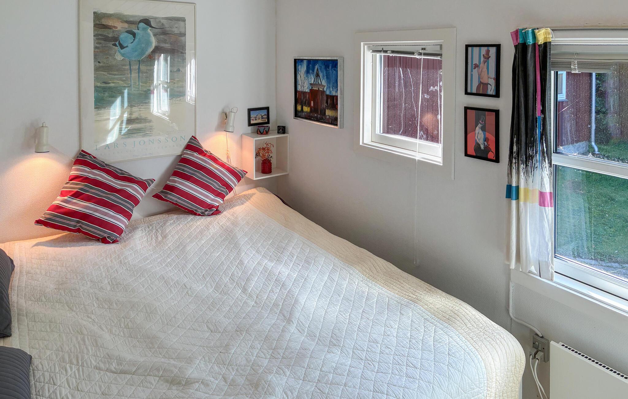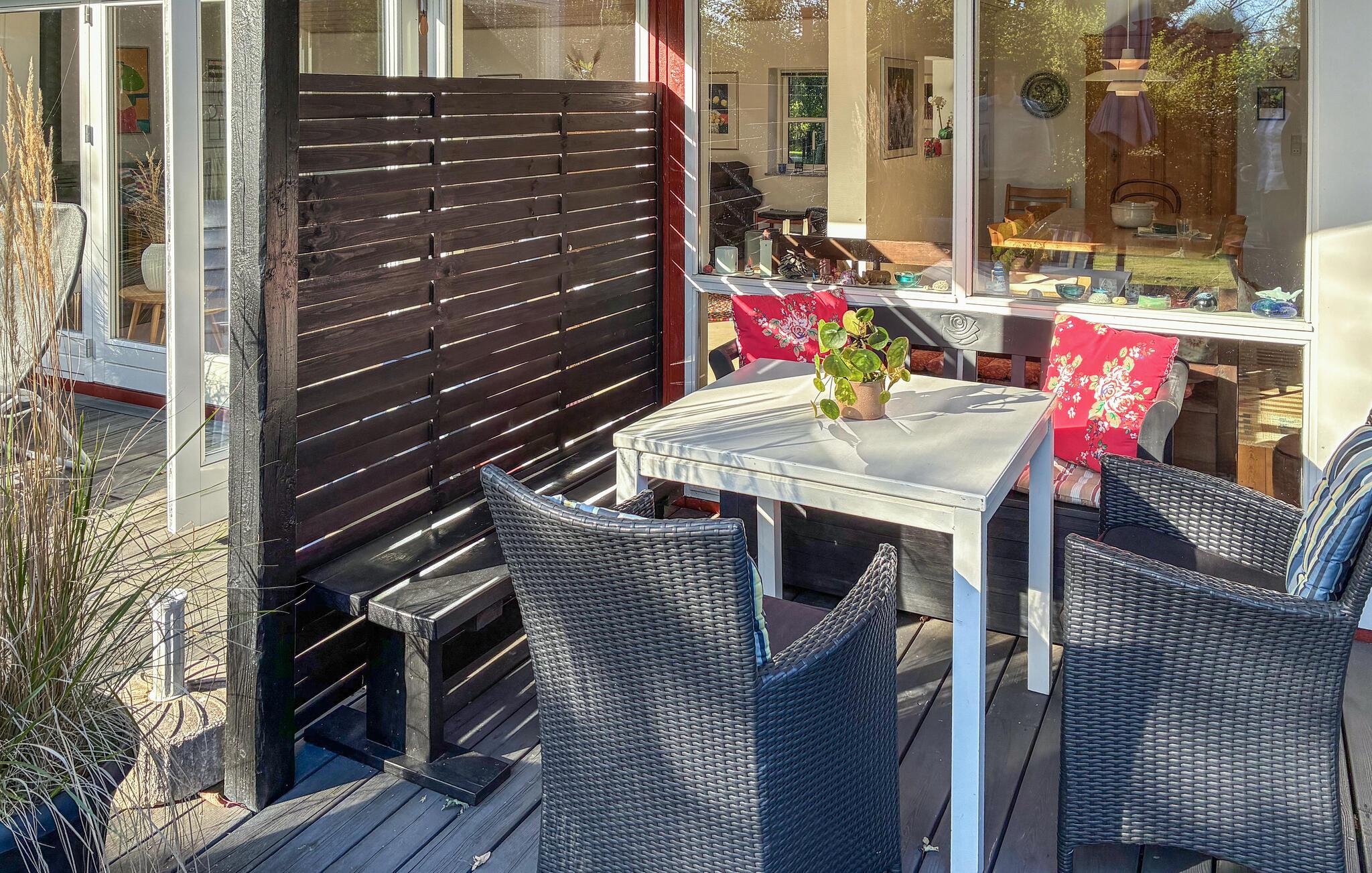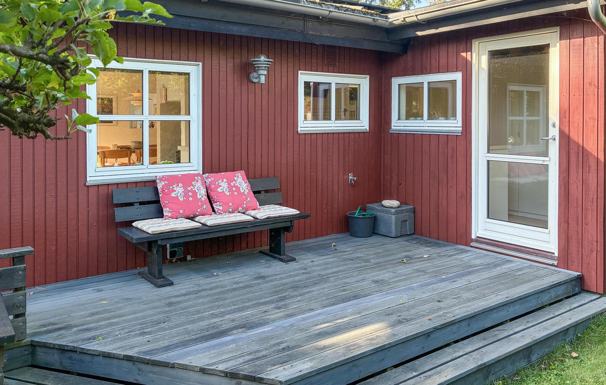 Draußen lädt die weitläufige Holzterrasse zum Verweilen ein. Nehmen Sie Ihr Frühstück an der frischen Luft, grillen Sie am Abend und genießen Sie den Blick in den gepflegten, grünen Garten. Unter den Bäumen finden Sie schattige Plätzchen, während Kinder auf dem Rasen spielen oder schaukeln können. Am nahe gelegenen Strand erwartet Sie ein Badesteg für erfrischende Sommermomente.