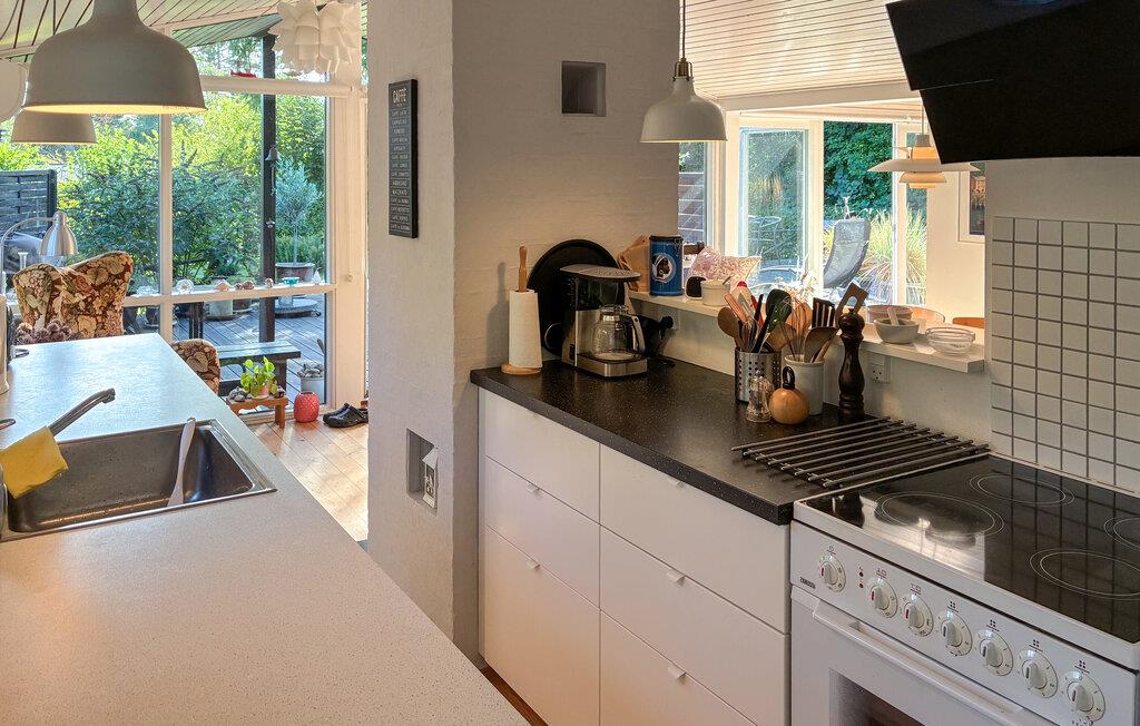 Freuen Sie sich auf einen Aufenthalt in Ihrem Ferienhaus, das skandinavisches Design mit wohnlicher Gemütlichkeit verbindet. Im Inneren erwartet Sie eine geschmackvolle Einrichtung mit viel Licht, warmen Farben und schönen Möbeln. Machen Sie es sich auf den Sofas im großen Wohnbereich gemütlich, während der Kamin an kühlen Abenden wohlige Wärme spendet. Die großen Fenster öffnen den Blick in den Garten und schaffen ein Gefühl von Weite. In der offenen Küche finden Sie alles, was Sie für gemeinsame Mahlzeiten brauchen. Genießen Sie diese am Esstisch mit direktem Zugang zur Terrasse.