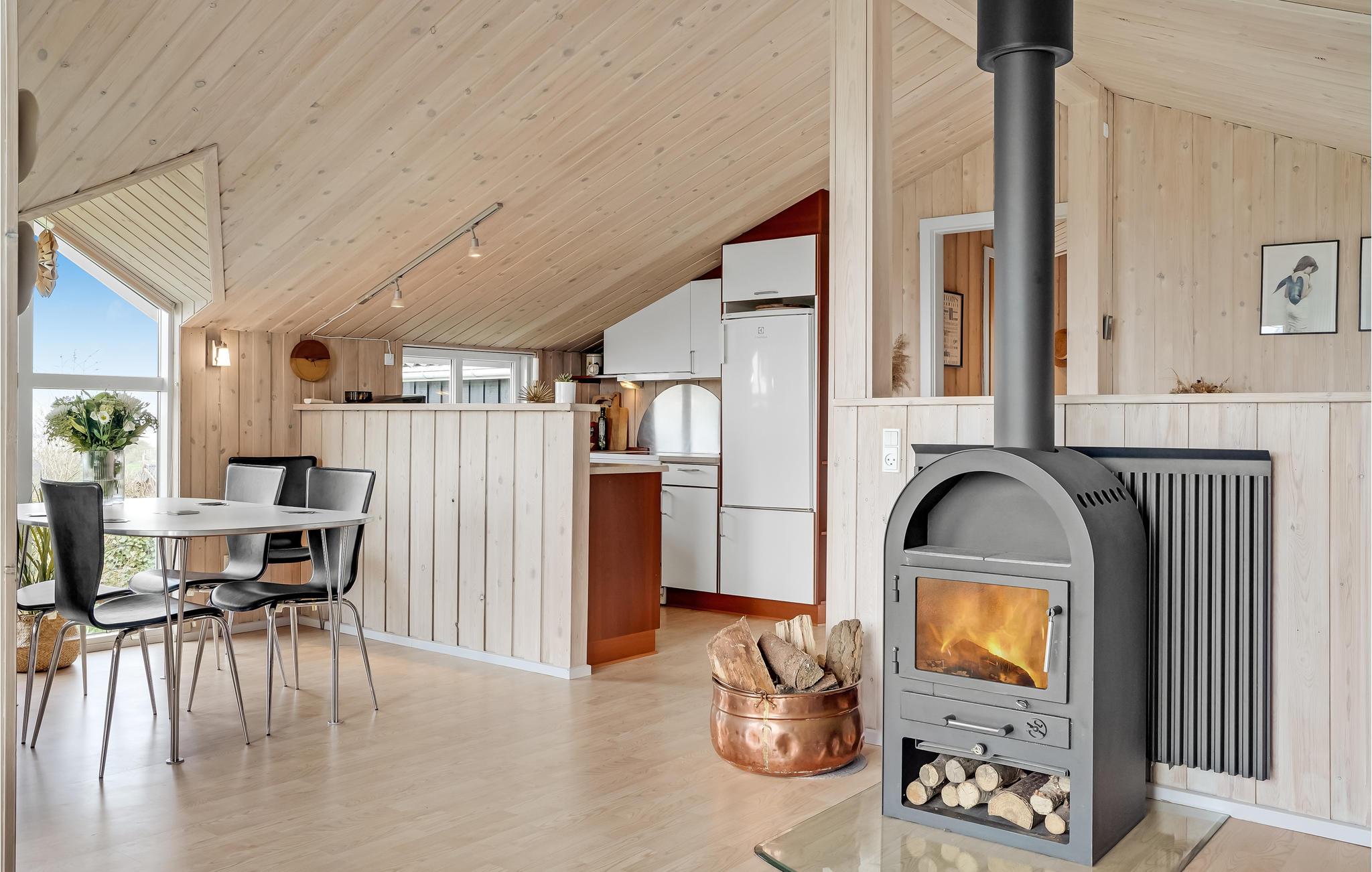 Charmantes dänisches Ferienhaus mit Kamin und Meerblick in Gjellerodde Strand, ideal für Naturliebhaber und Erholungssuchende.