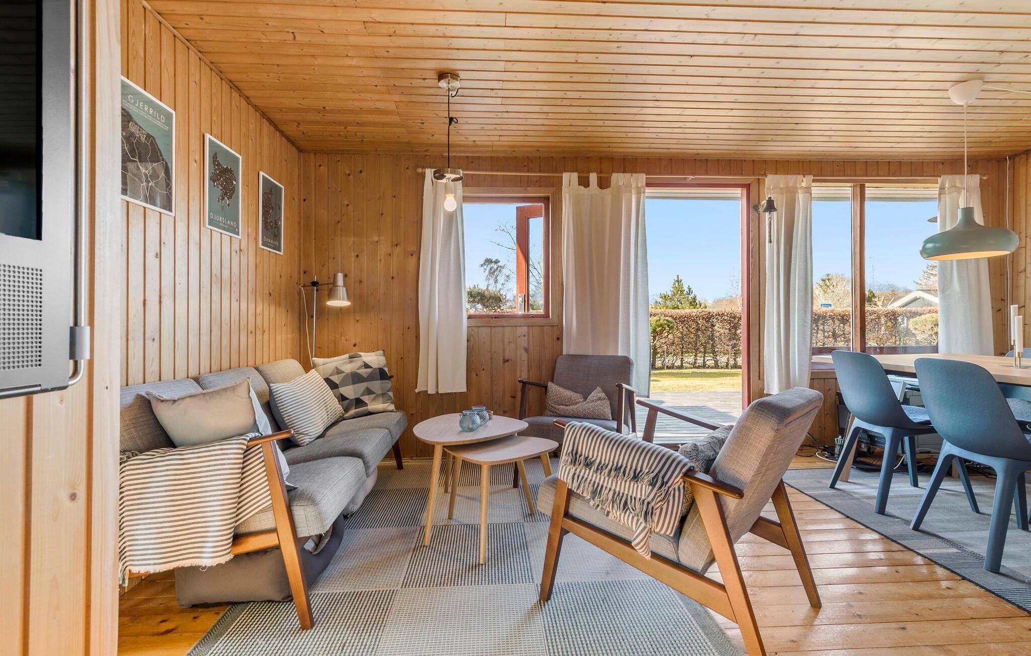Willkommen in Ihrem Ferienhaus, das nur einen kurzen Spaziergang vom nächsten Badestrand entfernt liegt. Verbringen Sie entspannte Stunden im gemütlichen Wohnbereich mit bequemen Sitzmöbeln und direktem Zugang zur Terrasse. Die offene Küche ist praktisch gestaltet und lädt zum gemeinsamen Kochen ein. Am schönen Esstisch findet die ganze Familie Platz, ideal für Spieleabende oder gemeinsame Mahlzeiten. Der warme Holzton im Innenraum sorgt für eine behagliche Atmosphäre, in der Sie sich sofort zu Hause fühlen.