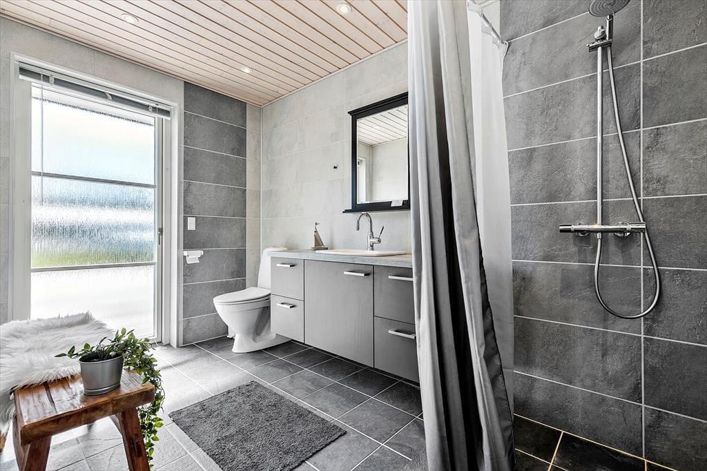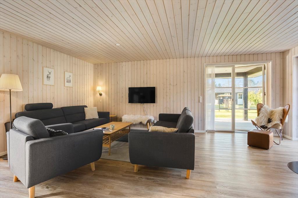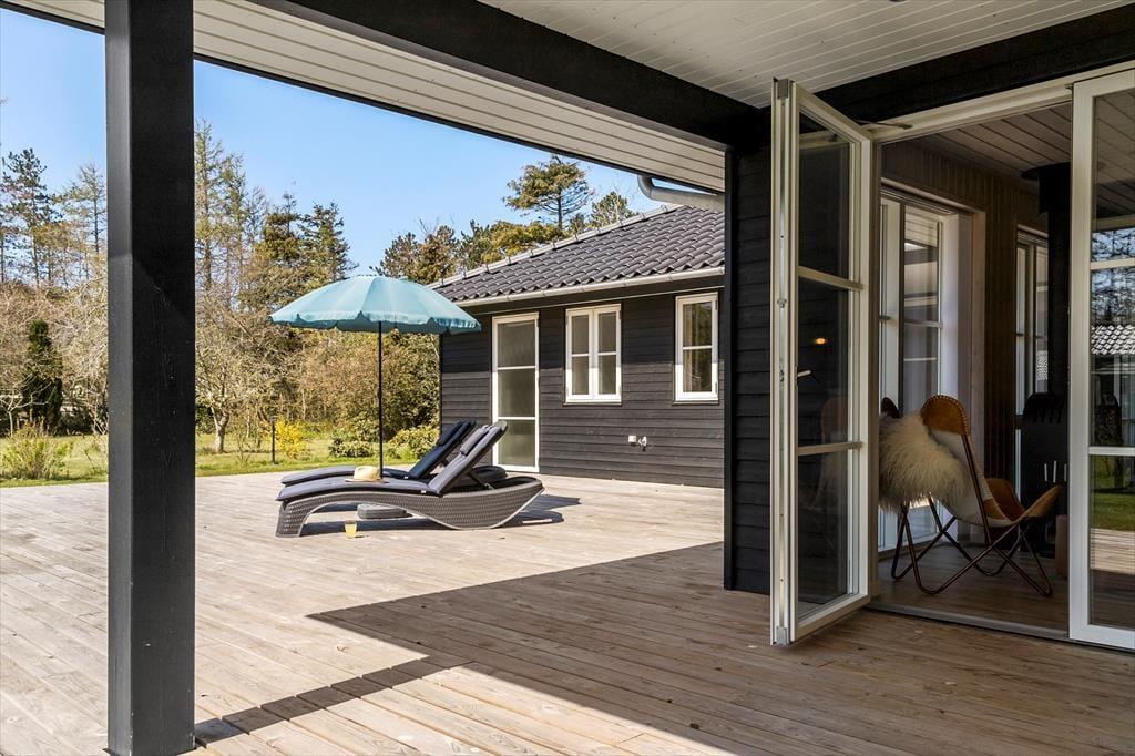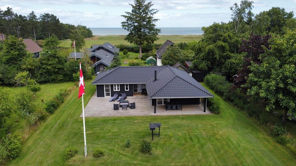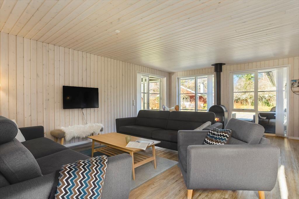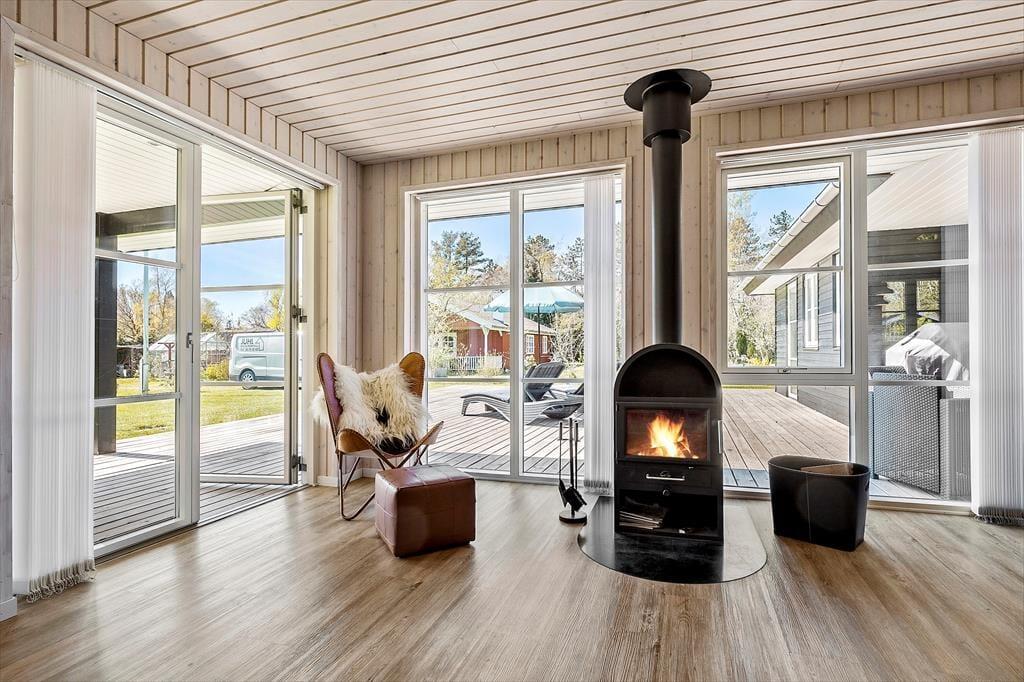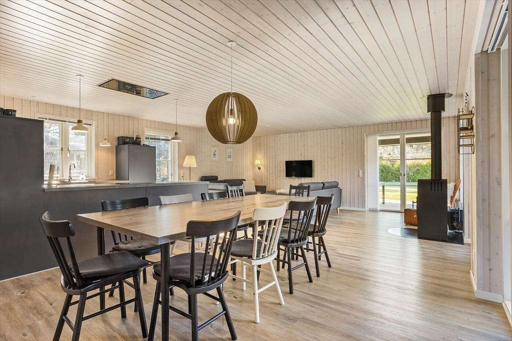 Nah am schönen Badestrand Gjerrild Nordstrands empfängt Sie dieses tolle Ferienhaus mit einer Wohnfläche von 121 m². Das Haus ist gemütlich und geräumig. Es verfügt über eine wohldurchdachte Raumaufteilung. Die gut ausgestattete Küche ist offen mit dem Essbereich und dem Wohnraum kombiniert. Für Unterhaltung sorgt ein Fernseher. Im gesamten Raum erfreuen Sie sich am knisternden Kaminofenfeuer. Mehrere Ausgänge führen hinaus auf die hervorragende Sonnenterrasse. Zwei der insgesamt vier Schlafräume beinhalten ein Doppelbett. Im Dritten stehen zwei Etagenbetten mit vier Schlafplätzen bereit. Der vierte Raum verfügt über ein Schlafsofa. Ein schönes Badezimmer und ein Gäste-WC sind ebenso vorhanden wie ein Hauswirtschafts-/Eingangsbereich mit Waschmaschine. Dieses Mietobjekt präsentiert sich ausgesprochen schön und einladend.