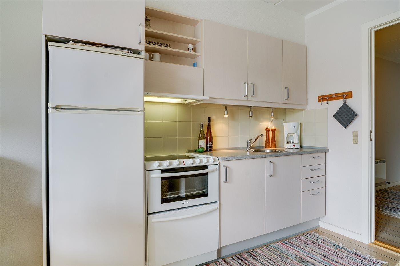 Die Küche ist mit Kühlschrank ausgestattet. Außerdem gibt es 4 Keramik-Kochfelder, Backofen sowie Geschirrspüler.