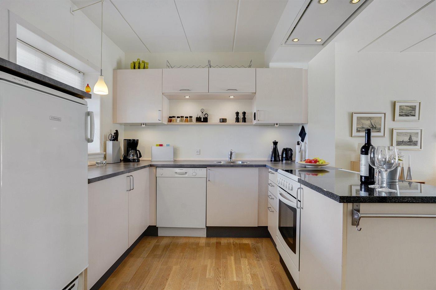 Die Küche ist mit Kühlschrank ausgestattet. Außerdem gibt es 4 Keramik-Kochfelder, Umluftofen sowie Geschirrspüler.