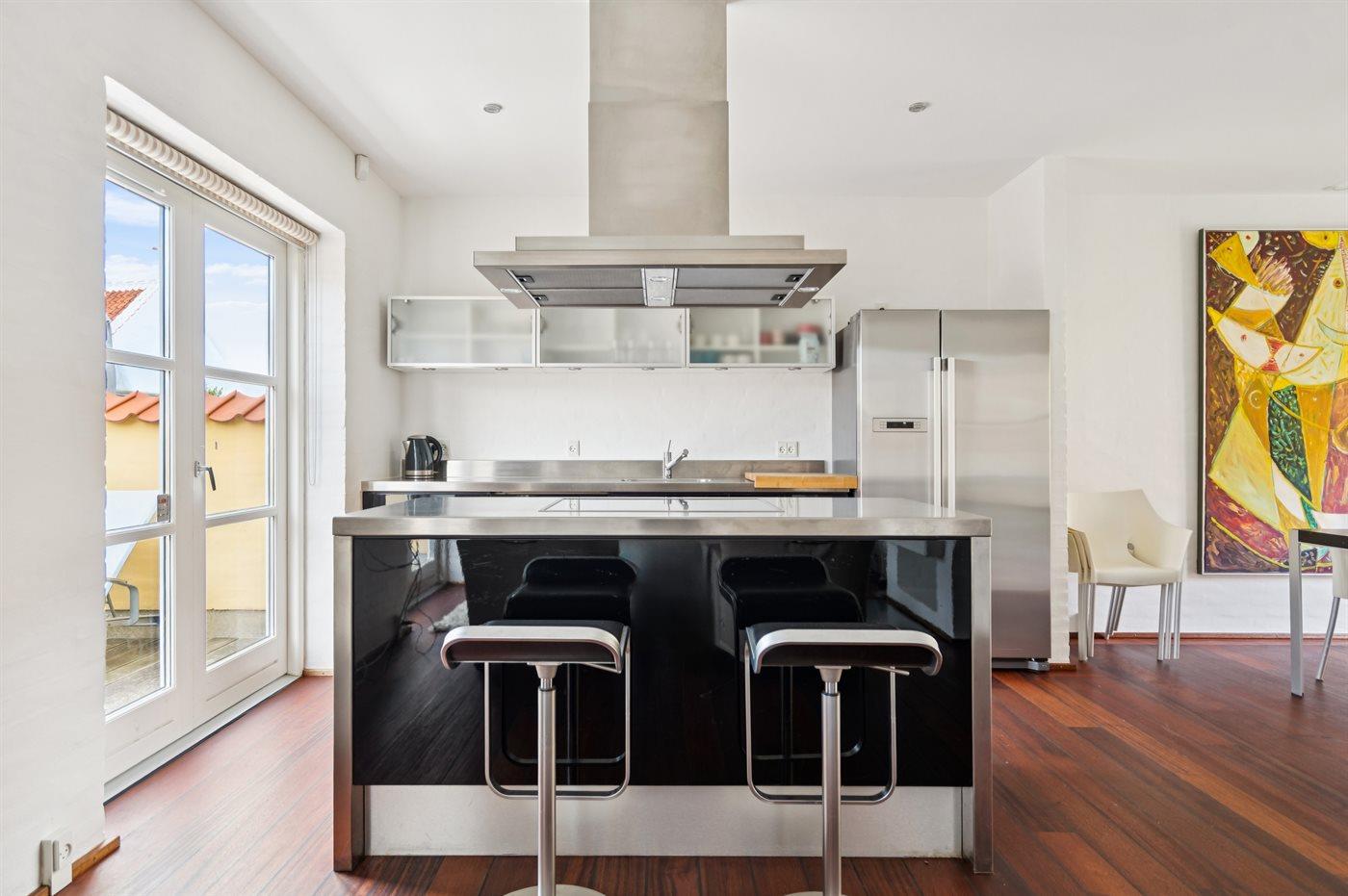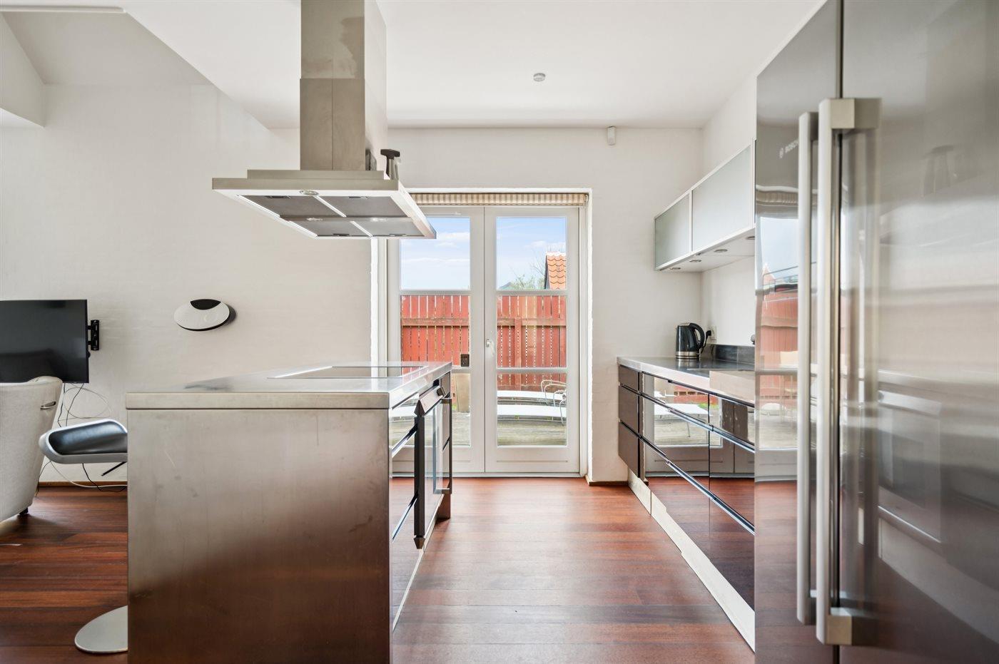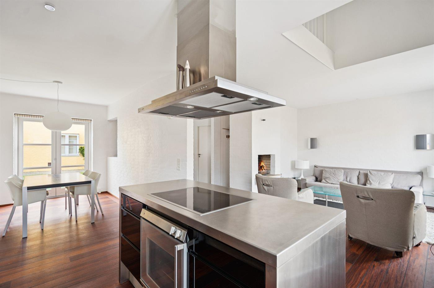Die Küche ist mit Kühlschrank ausgestattet. Außerdem gibt es 4 Induktions-Kochzonen, Umluftofen sowie Geschirrspüler.