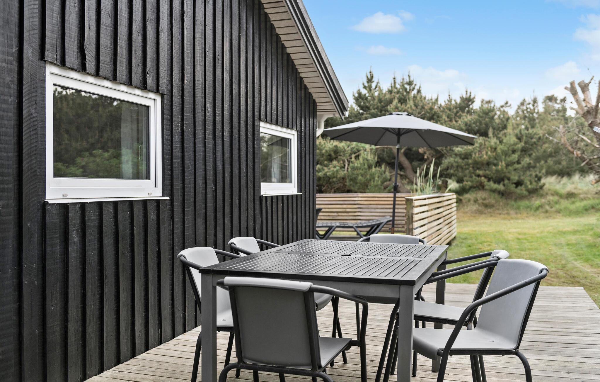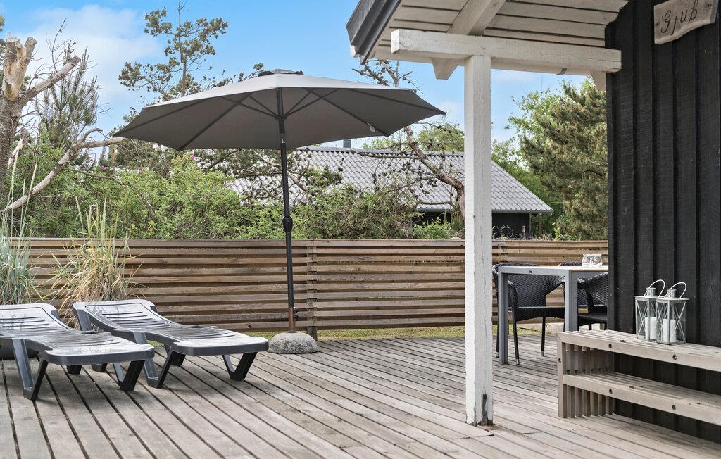 Gut gelegenes Ferienhaus mit 5 Minuten Fußweg zu einem der weissen Badestrände an der Westküste Grærup. Das Haus liegt auf einem schönen, geschlossenen Grundstück, auf dem man sich ungestört auf den vielen Terrassen rund ums Haus aufhalten kann. 15 Minuten Fahrt zum Golfplatz in Ho. Fahrradweg nach Vejers Strand.