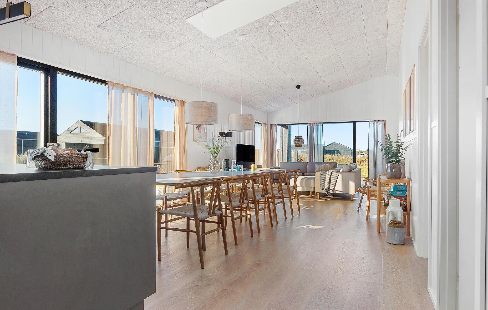 Dieses gemütliche Ferienhaus, das ideal für zwei Familien geeignet ist, am Løkken Strand vereint skandinavischen Charme mit modernen Annehmlichkeiten. Beginnen Sie den Tag mit einem entspannten Frühstück am großen Holzesstisch und genießen Sie dabei den herrlichen Ausblick durch die bodentiefen Fenster auf die Natur. Alternativ können Sie auch auf der weiträumigen Terrasse speisen, die Ihnen bei schönem Wetter ein angenehmes Ambiente bietet. In der offenen, modernen Küche lässt sich jede Mahlzeit bequem zubereiten.