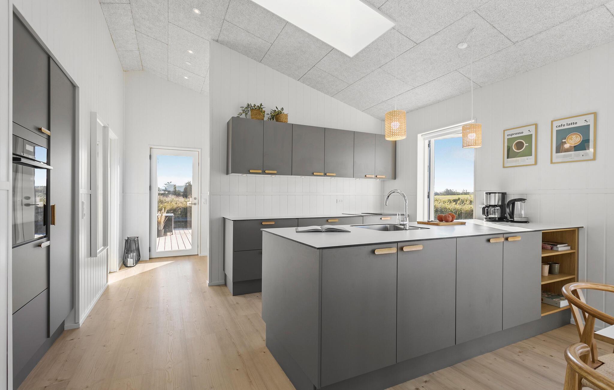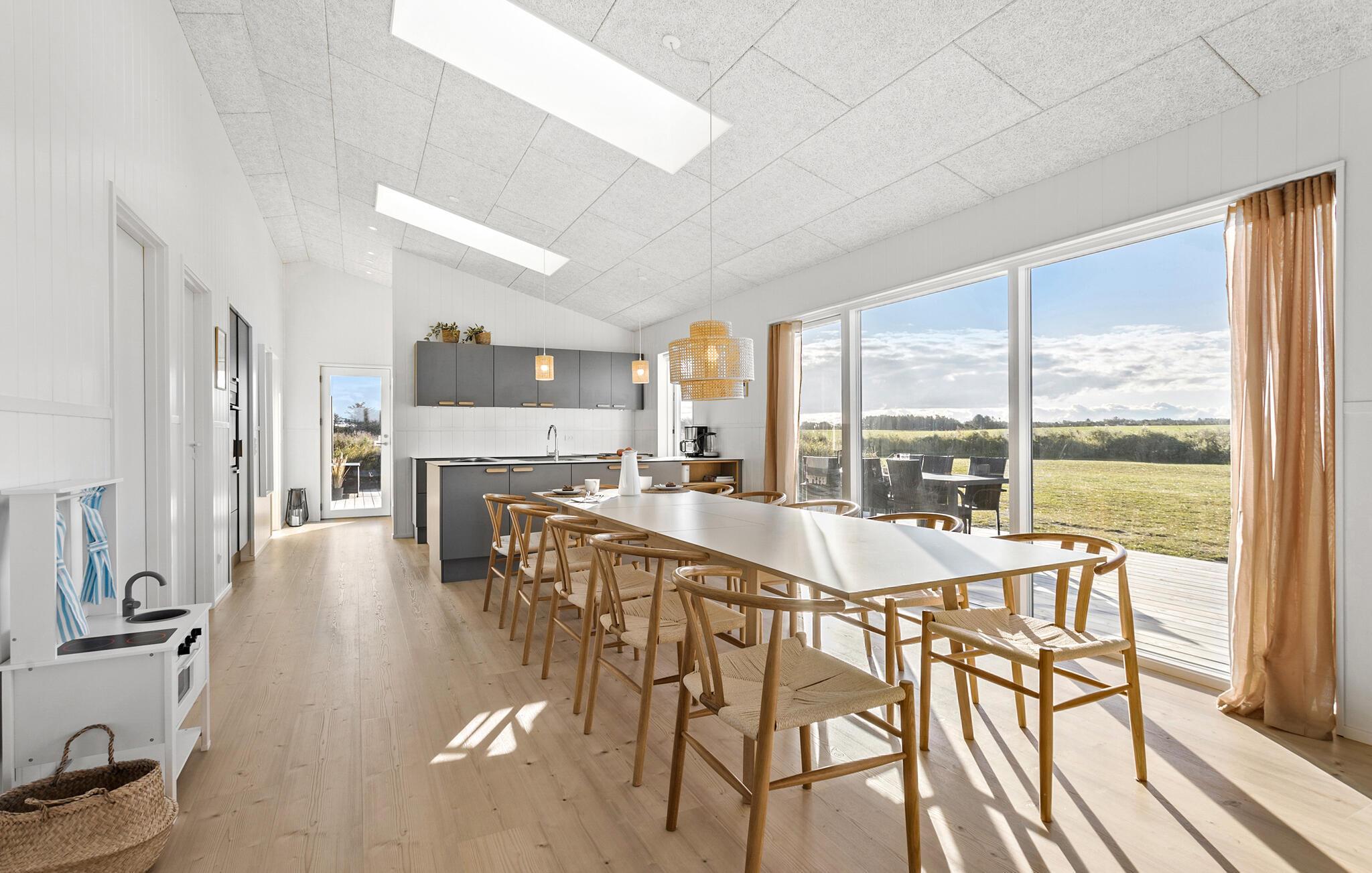 Ihr geräumiges Ferienhaus am Løkken Strand, mit Platz für mindestens zwei Familien, bietet Ihnen die ideale Mischung aus Komfort und skandinavischer Gemütlichkeit. Beginnen Sie den Tag entspannt mit einem gemütlichen Frühstück am großzügigen Holzesstisch, während Sie den Blick durch die großen Fenster in die umliegende Natur schweifen lassen. Oder genießen Sie Ihr Essen im Freien auf der geräumigen Terrasse, die durch das schützende Holzdach auch bei wechselhaftem Wetter ideal ist. In der offenen, modernen Küche können Sie Ihre Mahlzeiten mühelos zubereiten.