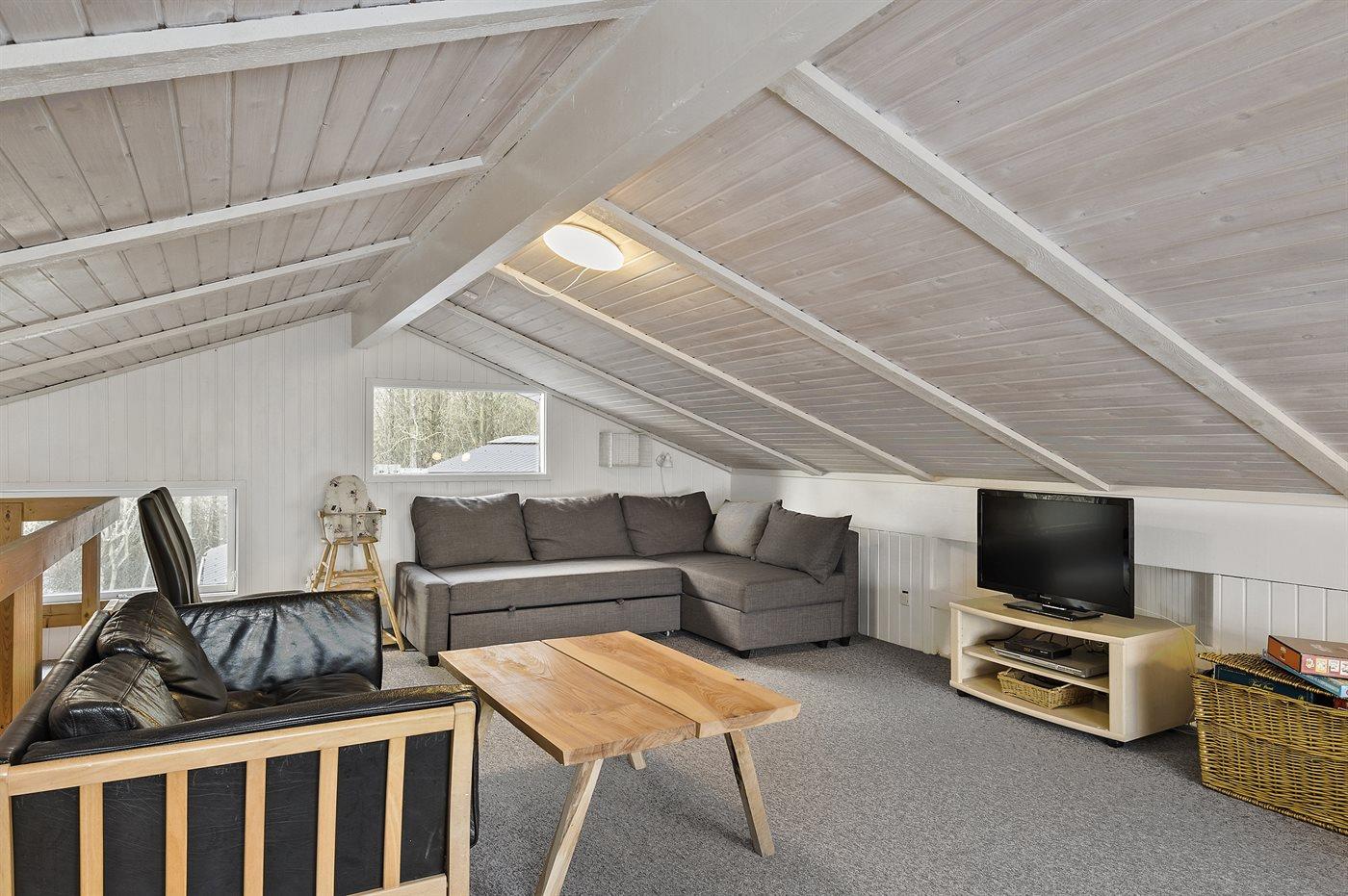 Im offenen Obergeschoss befindet sich ein weiteres Wohnzimmer mit Fernseher und Chromecast. Auf dem Sofa im offenen Obergeschoss befinden sich die letzten zwei Schlafplätze (Ausziehsofa).