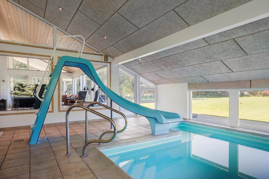 Vom Wohnzimmer aus gelangt man in einen 40m² großen Poolraum mit einem 17m² großen Becken und einer kleinen Ecke für die Kleinsten mit geringerer Wassertiefe. Es gibt eine Treppe ins Wasser, und man hat auch die Möglichkeit, über die Rutsche ins Wasser zu gelangen. Man kann sich auch im Whirlpool entspannen, während die Kinder im großen Becken spielen, und schließlich hat man vom Raum aus Zugang zum großen Badezimmer mit Sauna.