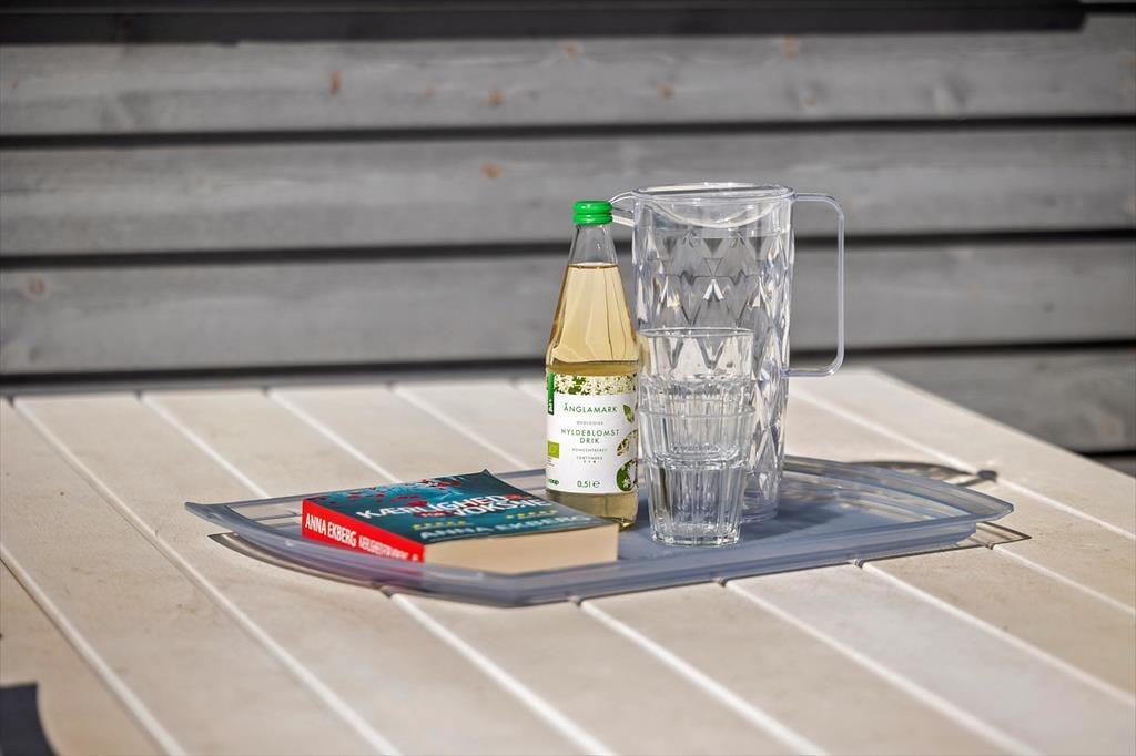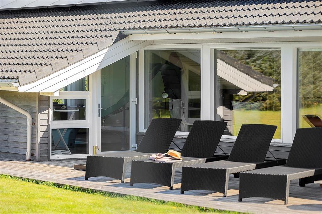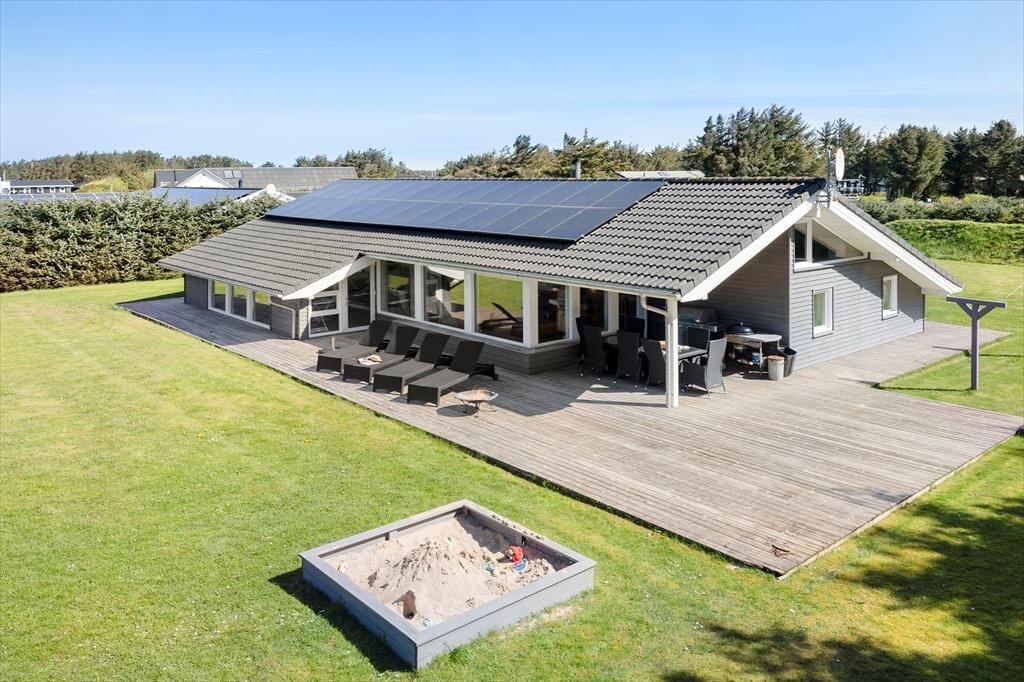 Zum Ferienhaus gehört ein großes Naturgrundstück mit viel Platz zum Spielen, Ballspielen und Sonnenbaden. Die 200m² große Terrasse zieht sich rund ums Haus, sodass man den Sonnenstrahlen den ganzen Tag über folgen kann, von morgens bis abends. Vom Wohnzimmer aus führt ein Teil der Terrasse unter ein Dach, wo man abends gemütlich sitzen kann, wenn die Sonne untergegangen ist und der Tau beginnt zu fallen.