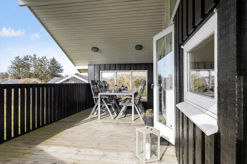 Zum Ferienhaus gehört ein geschlossener Garten, in dem Familien den dänischen Sommer genießen und in Ruhe und Frieden entspannen können. Kinder spielen Ball auf der Wiese und buddeln im Sandkasten oder Schaukeln und die Erwachsenen betrachten das Ganze von der großen, eingezäunten Terrasse. Ein Teil der Terrasse ist überdacht und für gemütliche Stunden am Abend ideal.