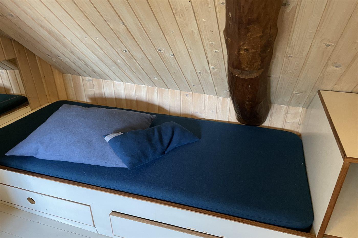 8 der insgesamt 10 Schlafplätze befinden sich im Obergeschoss des Hauses und verteilen sich auf 2 Zimmer mit Doppelbetten und 2 Zimmer mit je 2 Einzelbetten. Die 2 Zimmer mit Einzelbetten sind Durchgangszimmer (siehe Grundriss). Die Kojen sind mit Federkernmatratzen ausgestattet. Ferner gibt es ein Zimmer mit 1 Einzelbett im Erdgeschoss. Das Haus ist mit 2 Trip-Trap Kinderstühlen und 1 Stokke-Kinderbett ausgestattet. Das Kinderbett kann auch als Laufgitter benutzt werden.