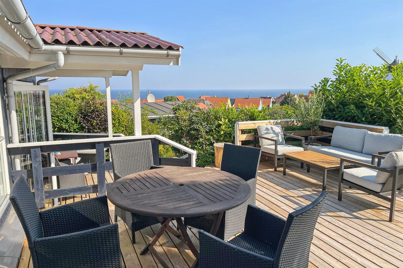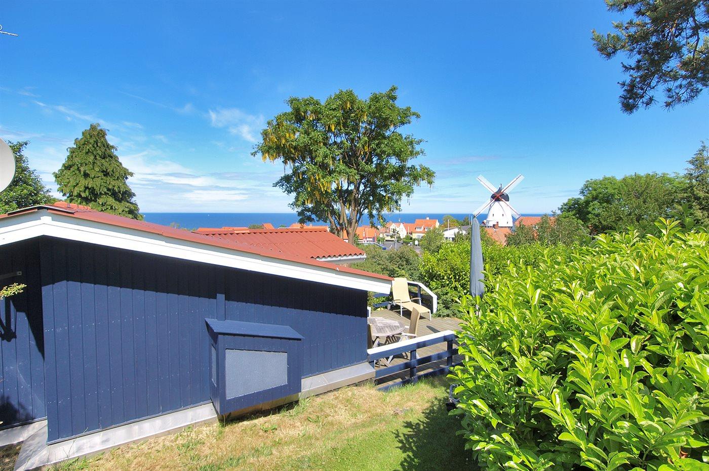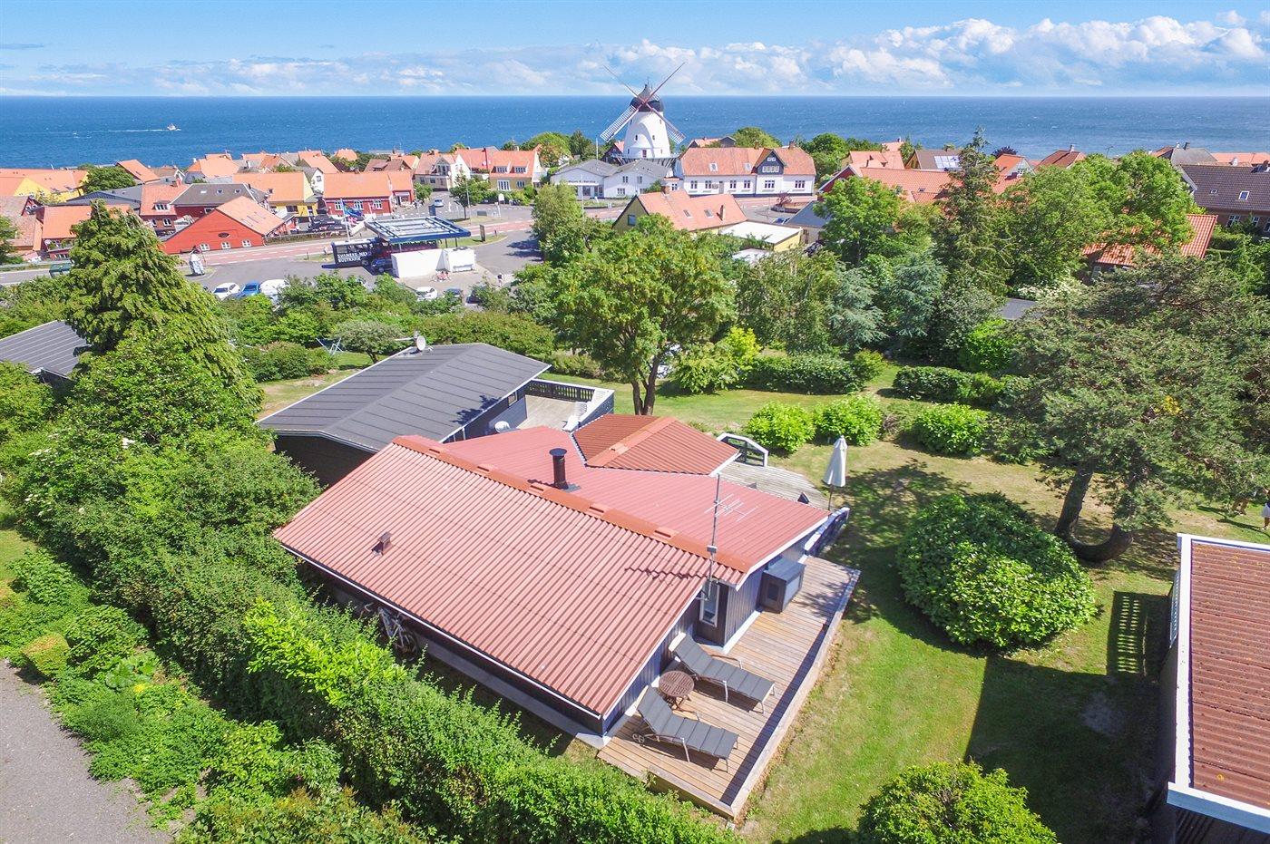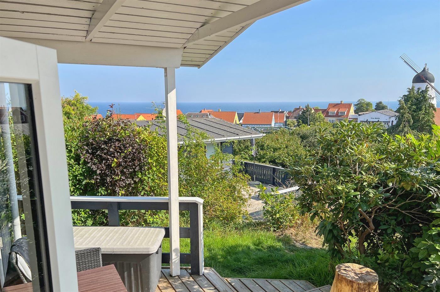 Das Haus hat eine Wohnfläche von 58 m² und bietet den schönsten Panoramablick über die Stadt Gudhjem und die Ostsee an. Außerdem wurde das Haus, das 1997 gebaut wurde, mehrfach modernisiert – zuletzt mit einer neuen Terrasse, die sich auf mehrere Ebenen verteilt. Hier kann man die Morgensonne auf der Aussichts-Terrasse und die Nachmittagssonne, in Ruhe und vor dem Wind geschützt, auf der Terrasse hinter dem Haus genießen. Neue Loungemöbel wurden 2024 aufgestellt.