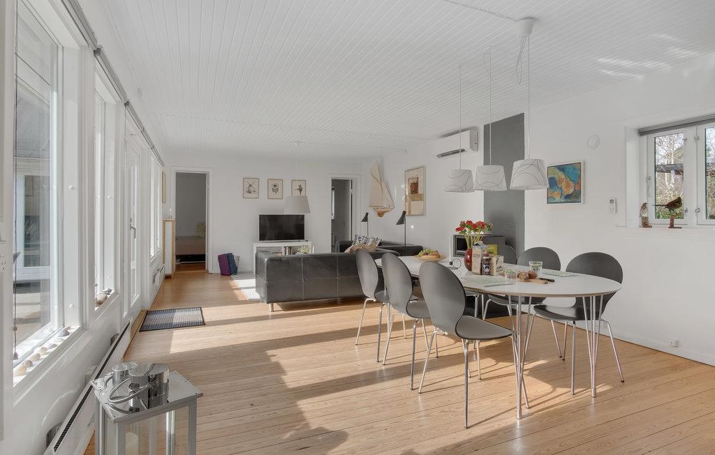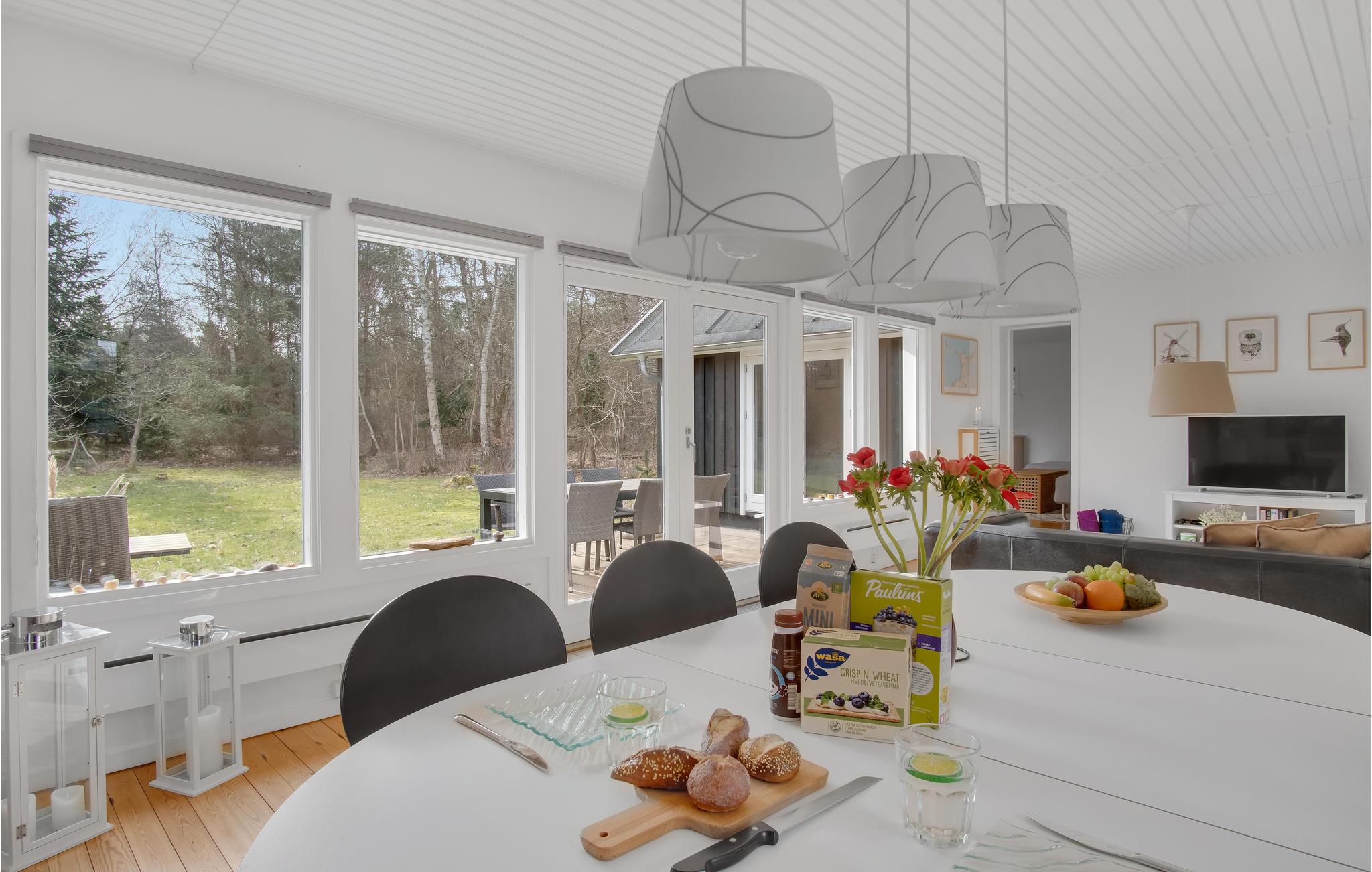 Das einladende Haus eignet sich gut für einen Urlaub mit Kindern. Großflächige Fenster lassen viel Licht in die Räume und machen das Ferienhaus zu einer Wohlfühloase. Speisen Sie gemeinsam mit wunderbarem Blick ins Freie und lassen Sie beim Entspannen auf dem Sofa den Blick über die Umgebung schweifen. Machen Sie es sich nach einem herrlichen Tag am Strand abends zu einem Filmabend auf dem Sofa bequem, feuern Sie im Kaminofen an und genießen Sie die gemütliche Atmosphäre.
