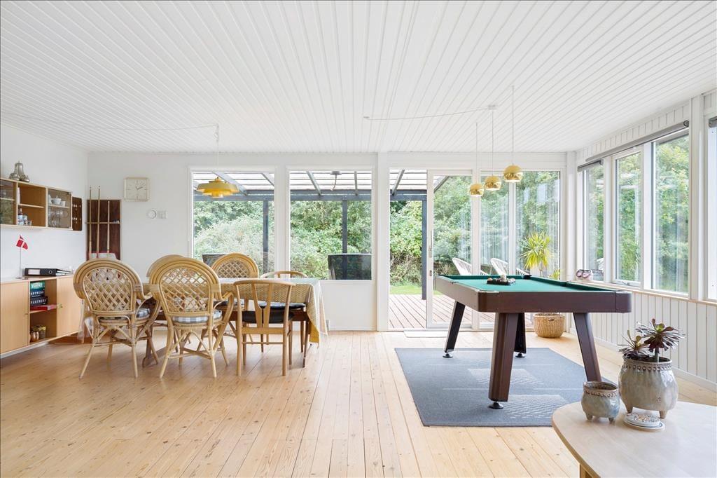 Das im Jahr 2021 umfassend renovierte Ferienhaus besticht mit einem hellen und freundlichen Inneren, das durch zurückhaltende Farbtöne und eine ansprechende Möblierung geprägt wird. Die großen Fenster verleihen dem Wohnraum einen schönen Tageslichteinfall und offenbaren gleichzeitig einen Ausblick auf die wunderschöne Küstenlandschaft mit dem Limfjord und dem Gyldendal Havn im Mittelpunkt. Der große Wohnraum begrüßt Sie mit einer Polstersitzgarnitur, einem Essplatz und einer gemütlichen Ecke vor dem Kaminofen. Für Spaß und Unterhaltung sorgen ein Billardtisch und ein Flachbild-TV mit Chromecast. Behagliche Temperaturen garantiert die Wärmepumpe, die an warmen Sommertagen mit ihrer Kühlfunktion zu begeistern weiß. Die offene Küche bietet gute Arbeitsbedingungen. Der Rest der Wohnfläche ist einem hellen Duschbadezimmer und drei guten Schlafräumen mit insgesamt sechs Schlafplätzen überlassen.