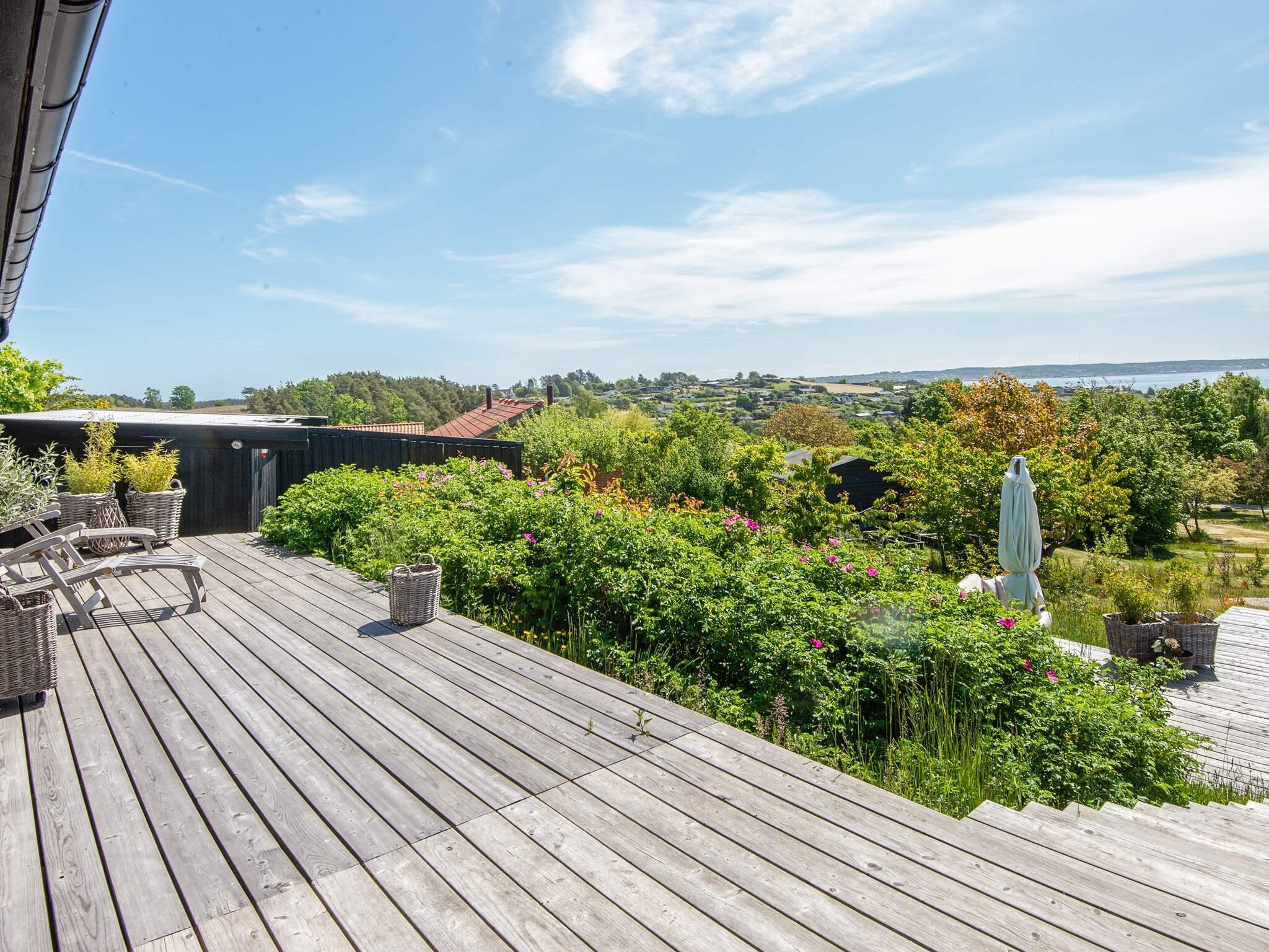 Ferienhaus mit erhöhter, attraktiver Lage und wunderbarer Aussicht zur Bucht von Ebeltoft, die Sie von der Terrasse aus genießen können. Hier ist Platz für Entspannung und Familienleben.