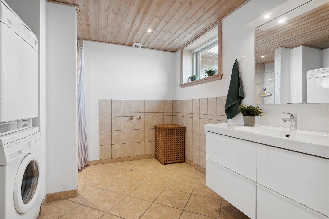 2 Badezimmer mit Duschnische und Fußbodenheizung. Im großen Badezimmer gibt es ferner Waschmaschine und Wäschetrockner. Die Küche ist in Verbindung mit der Essabteilung und ist mit u. a. Geschirrspüler, Mikrowelle, Tiefkühlgerät sowie Herd mit Ceran-Feld und Induktionsofen ausgestattet.
