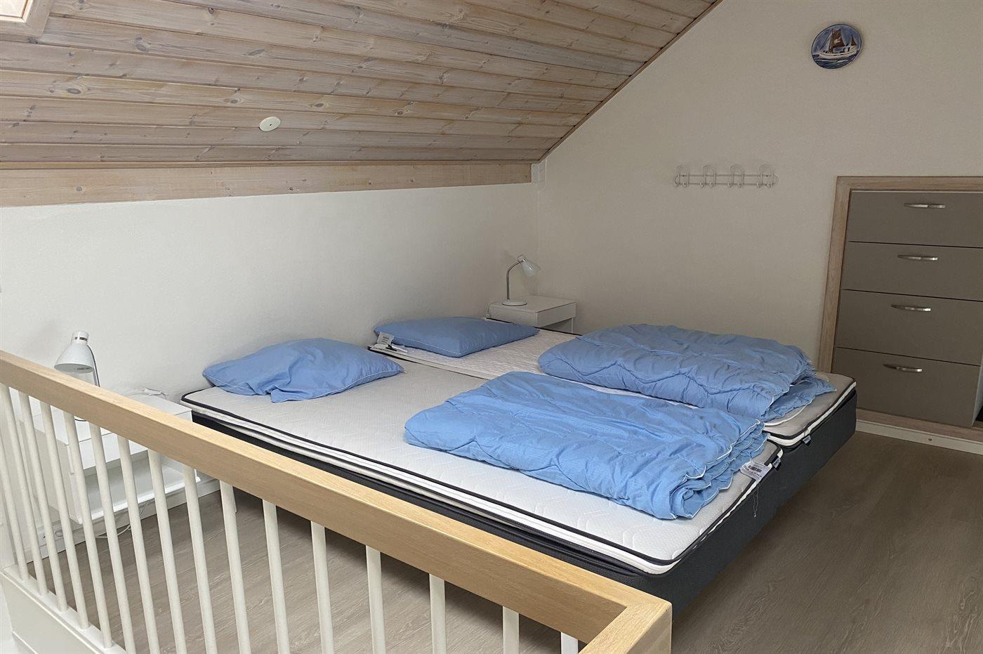 Im geräumigen Wohnzimmer gibt es TV, Stereoanlage mit CD-Spieler, Kaminofen und Aussicht. 3 Schlafzimmer mit Doppelbett. Außerdem gelangt man über eine gute Treppe in das große und geräumige offene Obergeschoss, das mit Doppelbett eingerichtet ist.