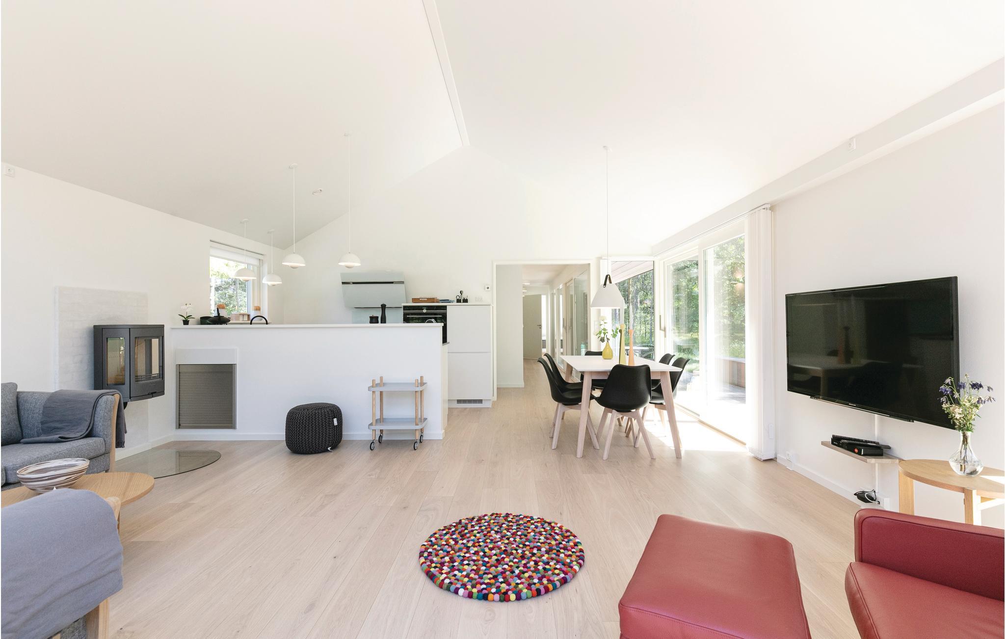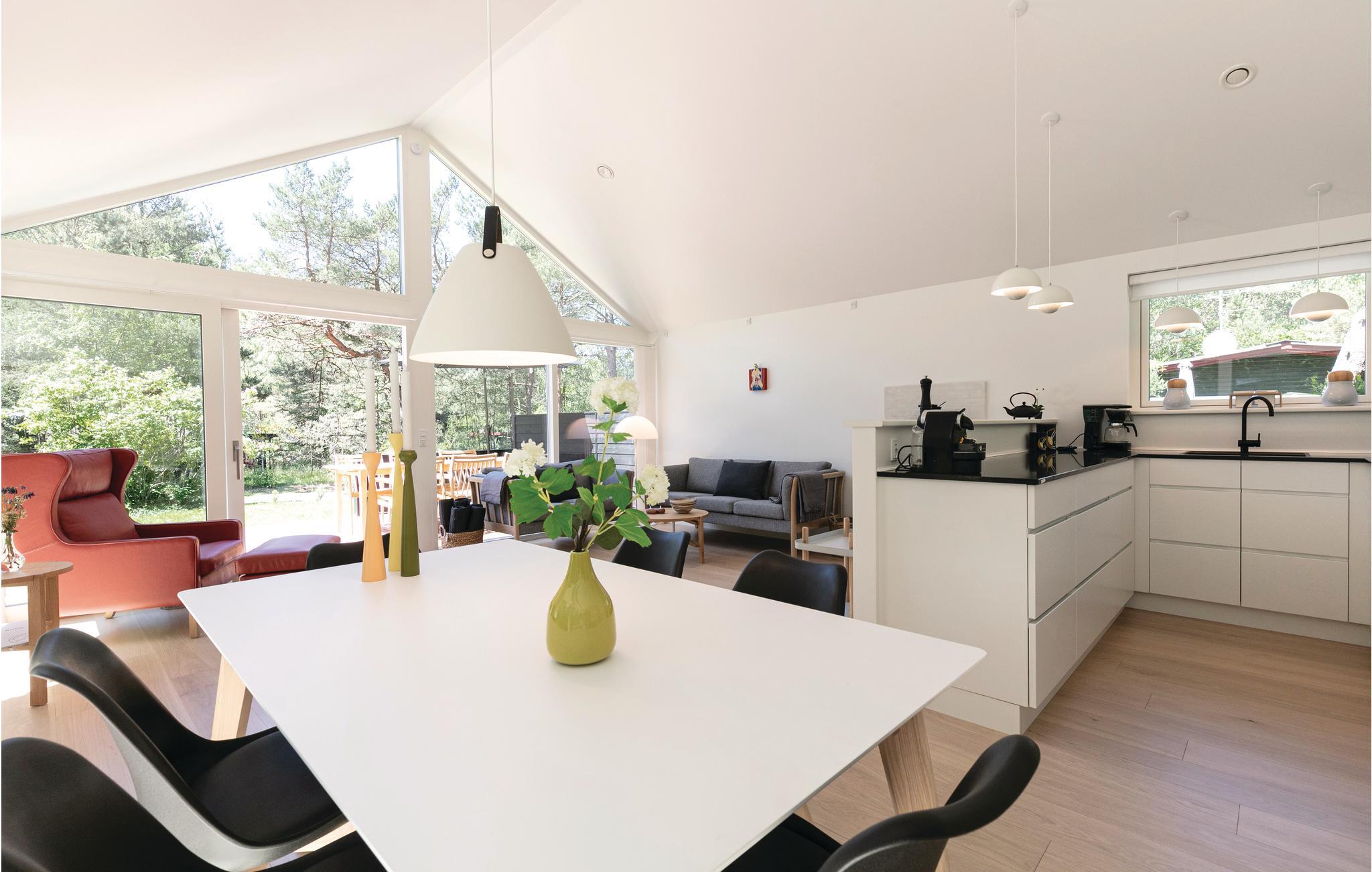 Modernes und schönes Qualitätsferienhaus mit heller und moderner Einrichtung und attraktiver Lage in der Nähe eines guten Sandstrandes, von Rad- und Wanderwegen umgeben. Dieses schöne und geräumige Ferienhaus erscheint insgesamt gut ausgestatteten mit einem großen offenen Ess- und Wohnbereich mit bequemen Möbeln, einem Holzofen und einer Wärmepumpe/Klimaanlage sowie kostenfreiem Internetzugang. Schöne, modern eingerichtete offene Küche, in der die Zubereitung der Urlaubsmahlzeiten mit Blick auf die Natur ein Vergnügen ist. In diesem schönen Ferienhaus mit hoher Qualität haben Sie 3 gute Schlafzimmer und vom Hauptschlafzimmer gelangen Sie direkt auf die Terrasse. 1 schönes Badezimmer sowie ein Gäste-WC, beide mit Fußbodenheizung und das WC mit Verbindung zum Hauptschlafzimmer. Vom Wohnzimmer aus gelangen Sie auf eine schöne große Holzterrasse, auf der Sie sich in den schönen Gartenmöbeln mit Blick auf Wald und Natur entspannen können. Sie können sich in der Ostsee erfrischen oder im Wald joggen gehen und auch zur Stadt Hasle ist es nicht weit vom Ferienhaus. Nutzen Sie auch die Außendusche, die sich am Haus befindet. Dort erwarten Sie gute Einkaufsmöglichkeiten, eine gemütliche Räucherei, ein Freibad und vieles mehr. Der hohe Komfort und die vielen modernen Einrichtungen des Hauses machen es für entspannten Urlaub zu jeder Jahreszeit geeignet.