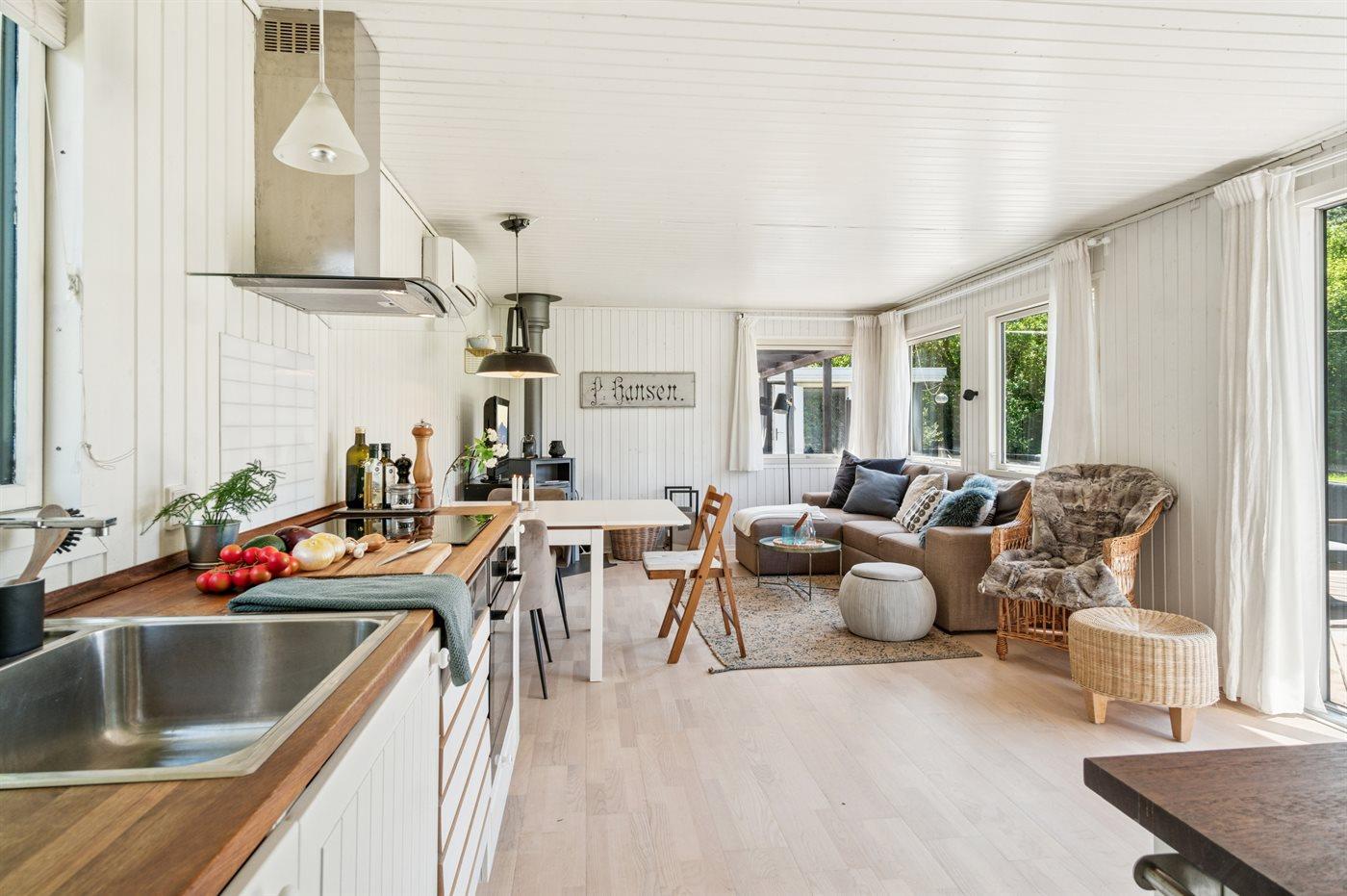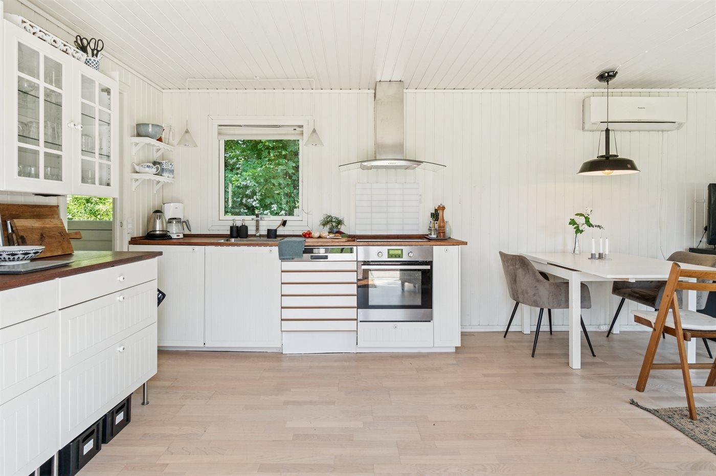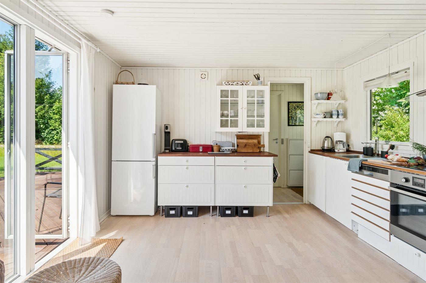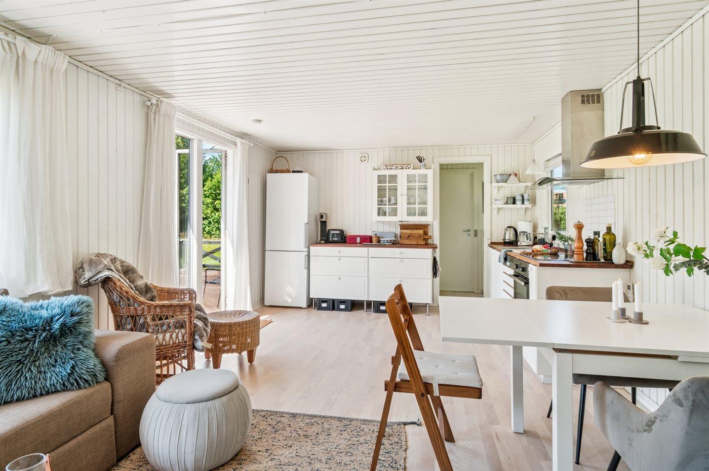 Das Haus ist mit einer gemütlichen Wohnküche eingerichtet, die offen in das Wohnzimmer übergeht – von hier aus gelangst du direkt auf eine große Terrasse, die teilweise überdacht ist. So findest du sowohl Schatten als auch Schutz vor Wind. Im Haupthaus gibt es ein Schlafzimmer mit Doppelbett sowie eine Gästetoilette. Im separaten Gästehaus findest du zwei weitere Schlafzimmer – eines mit Doppelbett, das andere mit einem Einzelbett (120x200 cm). Außerdem befindet sich dort ein Badezimmer mit Duschnische. Eine Waschmaschine steht ebenfalls zur Verfügung.