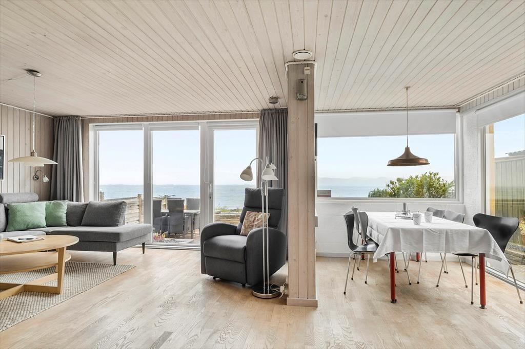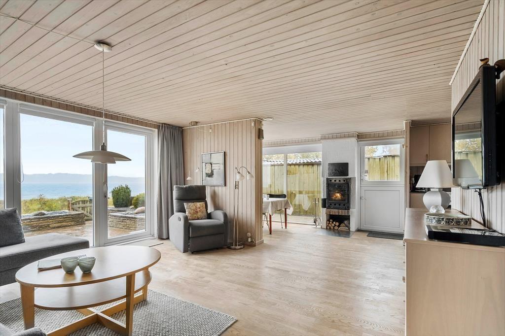 Wenn du dieses helle und schöne Sommerhaus betrittst, wirst du von einer einladenden Atmosphäre empfangen, die sofort zur Entspannung und Gemütlichkeit einlädt. Die Räume sind mit einer gemütlichen und angenehmen Note eingerichtet, die es leicht macht, sich wie zu Hause zu fühlen. Der offene Grundriss schafft einen wunderbaren Treffpunkt, an dem du mit deinen Liebsten am Esstisch bei Aussicht auf das Wasser essen kannst. Vom Wohnzimmer hast du direkten Zugang zur Terrasse, auf der du deinen Morgenkaffee mit spektakulärem Blick auf das Wasser und den Badeanleger genießen kannst, der nur wenige Schritte von der Tür entfernt ist. Hier gibt es auch die Möglichkeit, die Nächte in 2 Schlafzimmern zu verbringen, wo die Ruhe dich nach einem langen Tag voller Erlebnisse willkommen heißt.