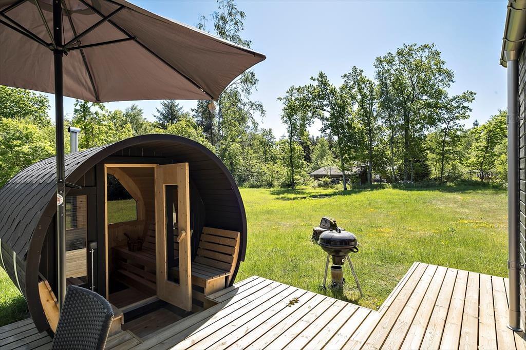 Dieses schöne Qualitätsferienhaus aus dem Jahr 2022 liegt gut platziert in einem kleinen, geschlossenen Weg in Helberskov. Wenige hundert Meter entfernt befindet sich bereits das Kattegat. Am Ferienhaus selber können Sie sich auf ein großes, grünes Grundstück freuen, auf dem Wildnisbad, eine Saunatonne und schöne Holzterrassen zu erholsamen Momenten im Freien einladen.