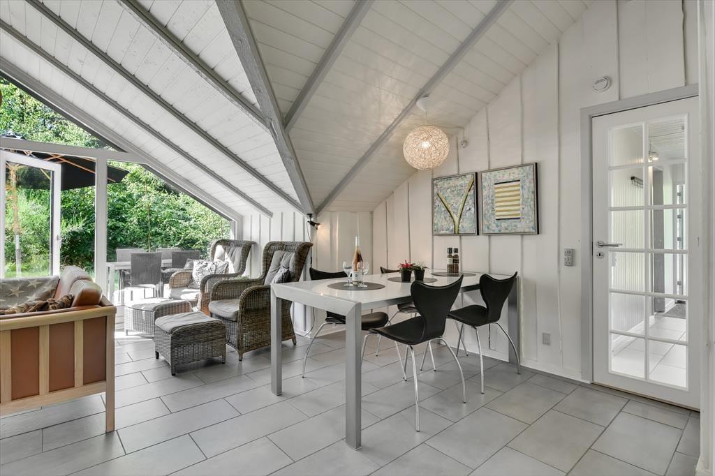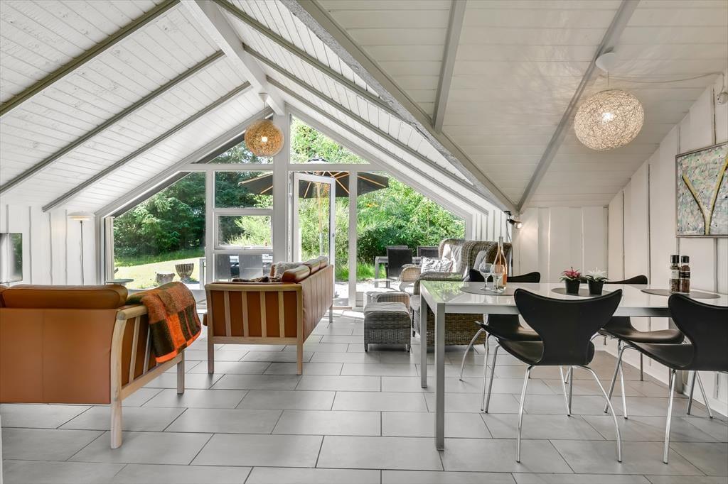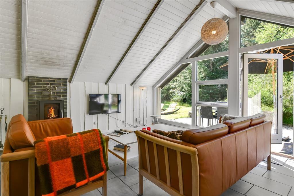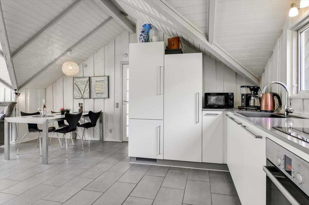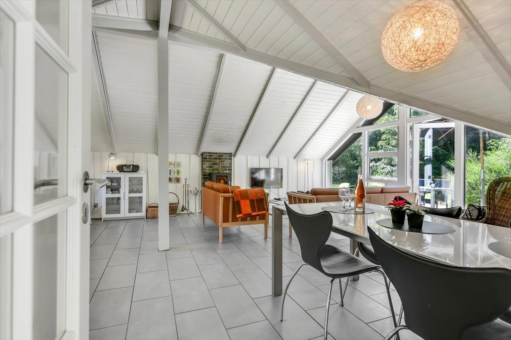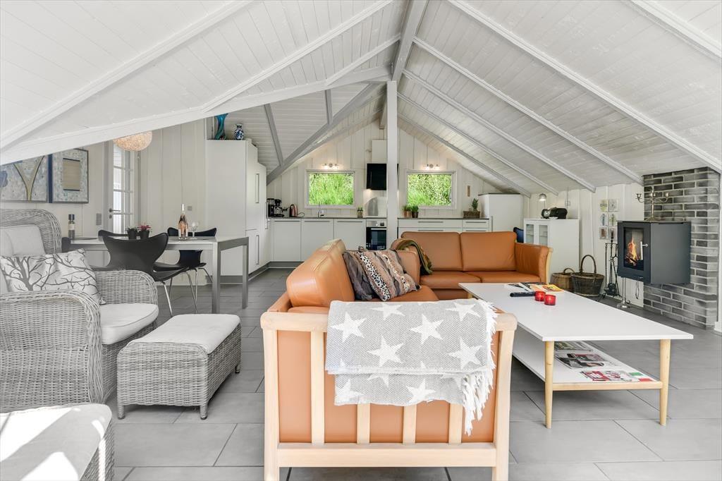 Wenn du das Ferienhaus betrittst, wirst du von einer hellen und offenen Küche/Essbereich/Wohnzimmer empfangen, das von einer gemütlichen Urlaubsatmosphäre geprägt ist. Die großen Fenster lassen viel natürliches Licht herein und schaffen ein helles und luftiges Raumgefühl. Hier kannst du dich am Esstisch versammeln, während du das Tagesgericht in der gut ausgestatteten Küche zubereitest, oder einen Abend mit Brettspielen und guten Gesprächen im komfortablen Wohnzimmer genießen. Die offene Raumaufteilung ermöglicht es, zusammen zu sein, selbst wenn verschiedene Aktivitäten gleichzeitig stattfinden. Als besonderes Extra gibt es die Möglichkeit, die Wärme des Holzofens zu genießen, falls das Wetter etwas kühler werden sollte. Es ist wirklich eine einladende Basis für einen entspannten Aufenthalt.