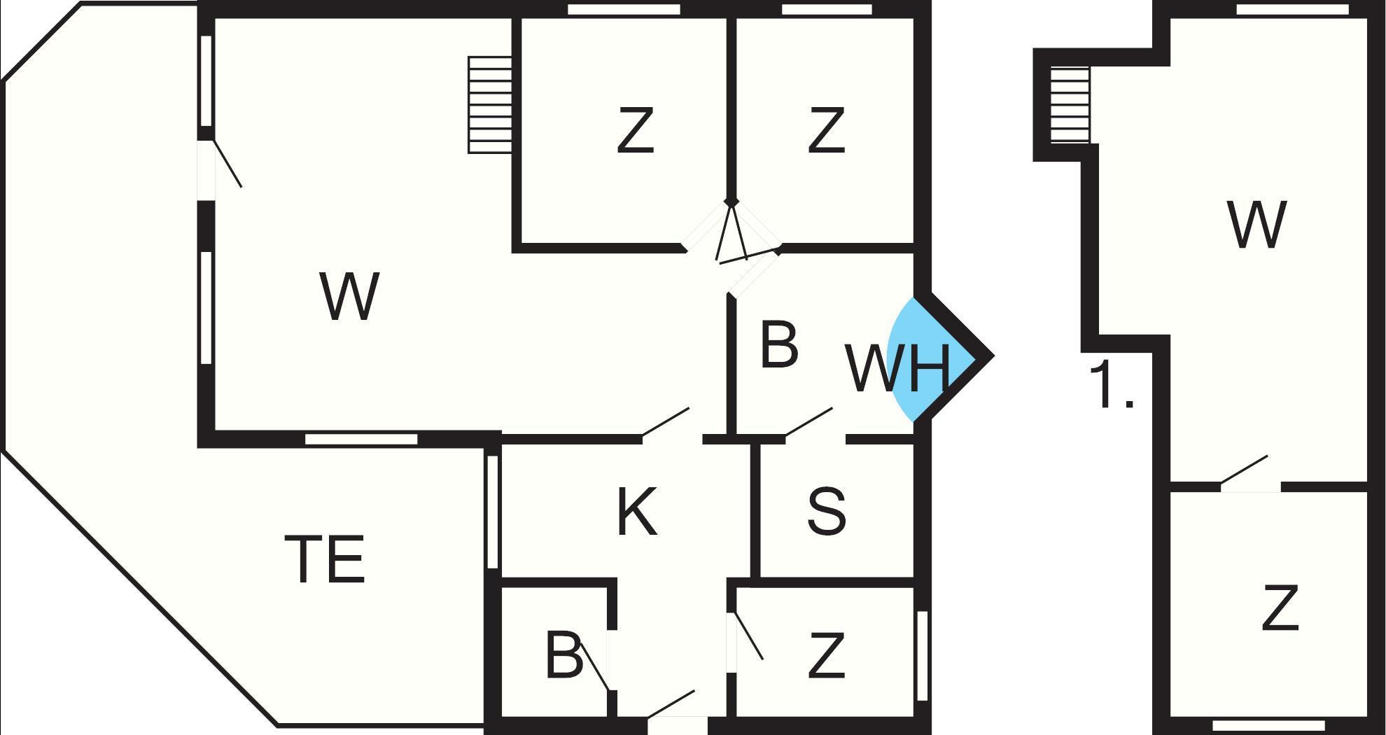 Im Erdgeschoss befinden sich drei Schlafzimmer, alle mit Doppelbett, und oben im 1. Stock befindet sich ein Wohnzimmer/eine Nische, in der verschiedene Spiele gespielt werden können. Im 1. Stock zudem weiteres Schlafzimmer mit Doppelbett.