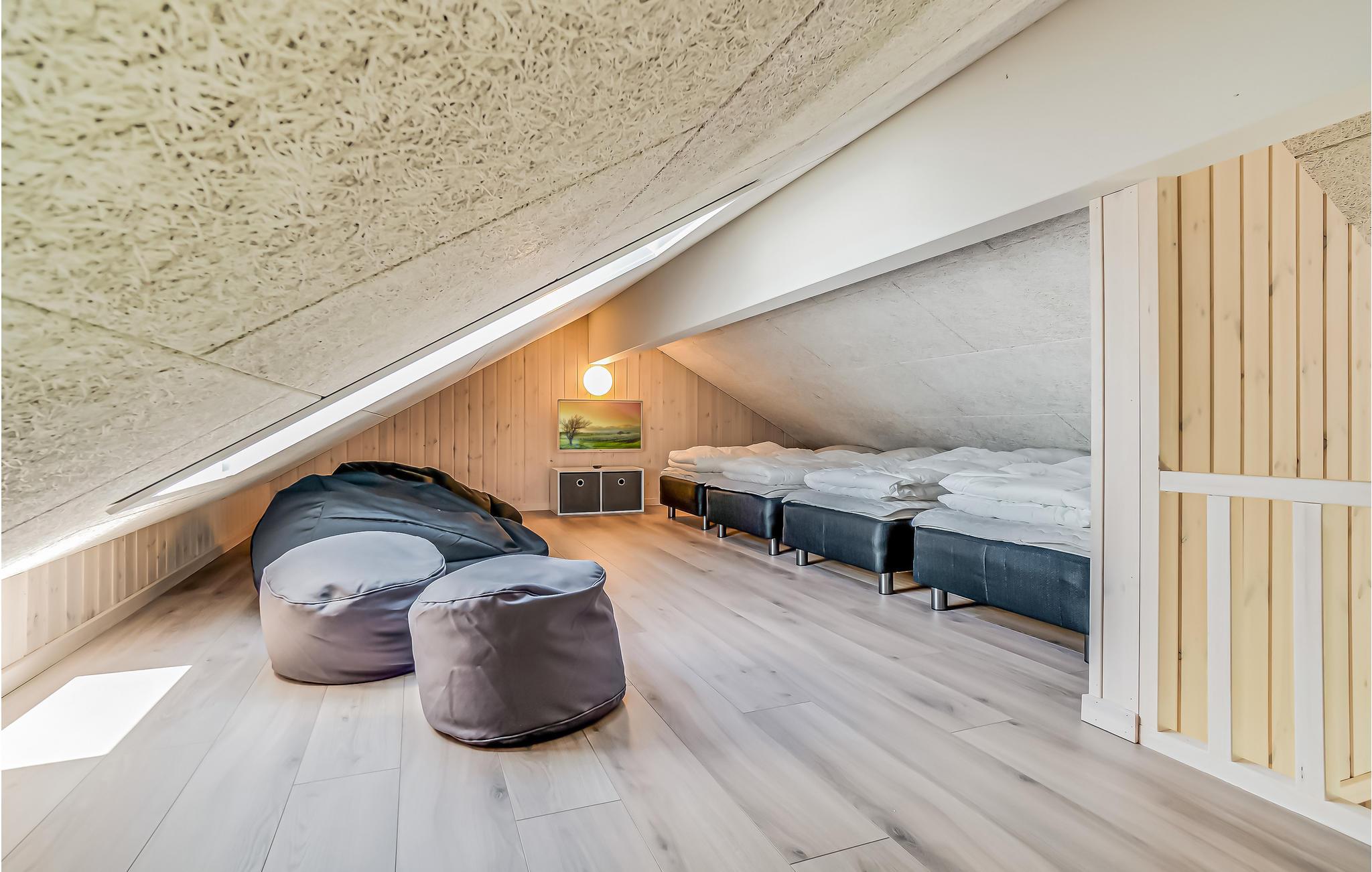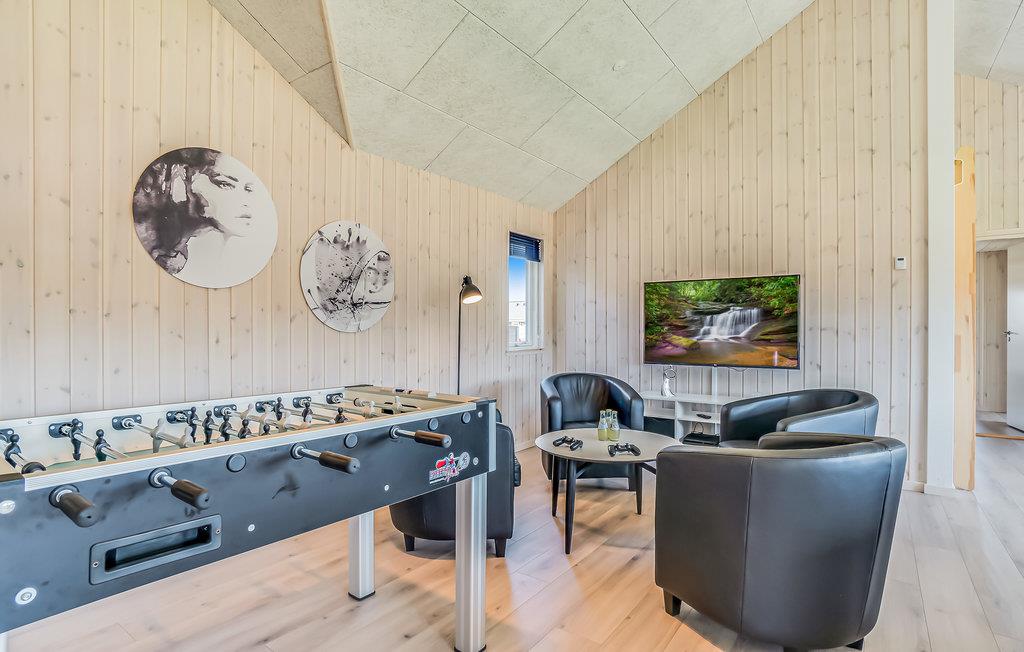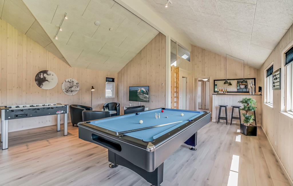 Das luxuriöse Ferienhaus eignet sich ideal für eine große oder mehrere Familien. Der Garten ist eingezäunt, sodass Kinder und Hunde unbeschwert und sicher spielen können. Die komfortable Wohnküche verfügt über eine Sofagruppe, TV sowie einen langen Esstisch mit Sitzgelegenheiten für alle. Machen Sie es sich an kühlen Abenden am Kaminofen gemütlich und bereiten Sie in der stilvoll eingerichteten Küche köstliche Mahlzeiten zu. Fordern Sie sich im Aktivitätsraum gegenseitig zu einer Partie Billard, Tischtennis oder Tischfußball heraus, während sich die Zuschauer ein kühles Getränk an der Hausbar gönnen. Das Haus hat einen eigenen Wellnessbereich mit beheiztem Swimmingpool, Wasserrutsche und Gegenstromanlage. Entspannen Sie auch im Whirlpool und genießen Sie die Wärme der Sauna.