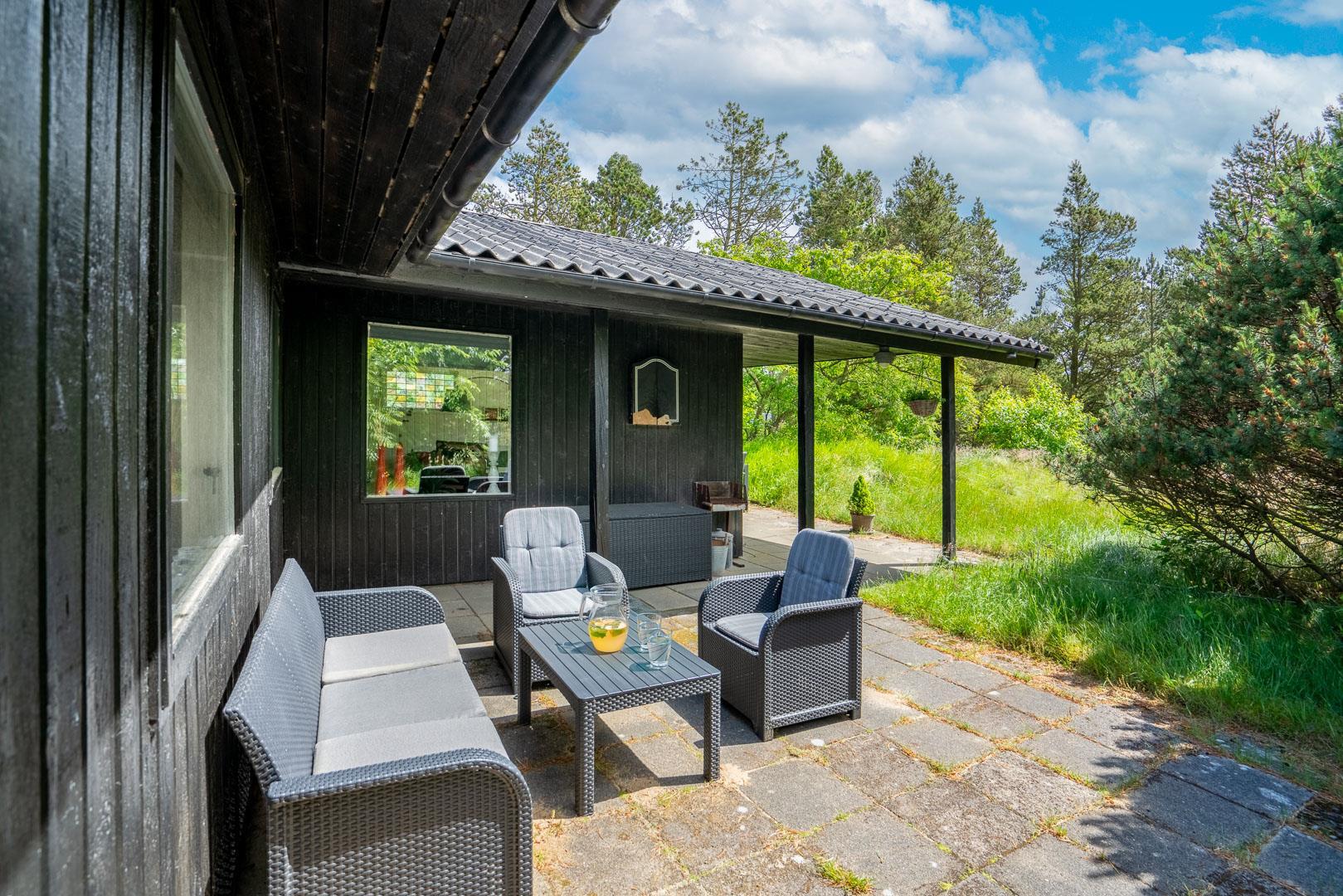 Die überdachte Terrasse des Ferienhauses ist der ideale Ort, um entspannte Stunden im Freien zu verbringen – ganz gleich, ob die Sonne scheint oder das Wetter typisch nordisch ist.