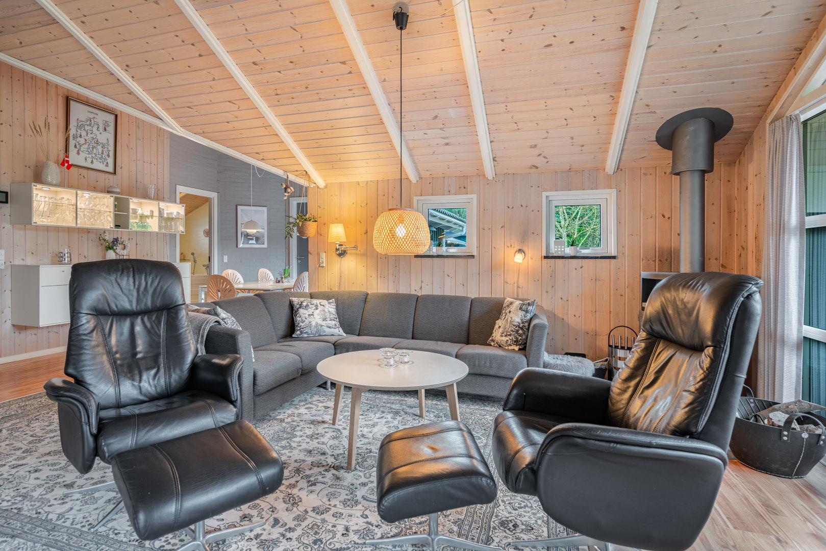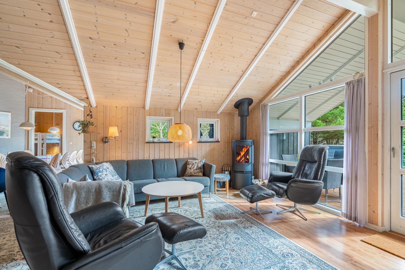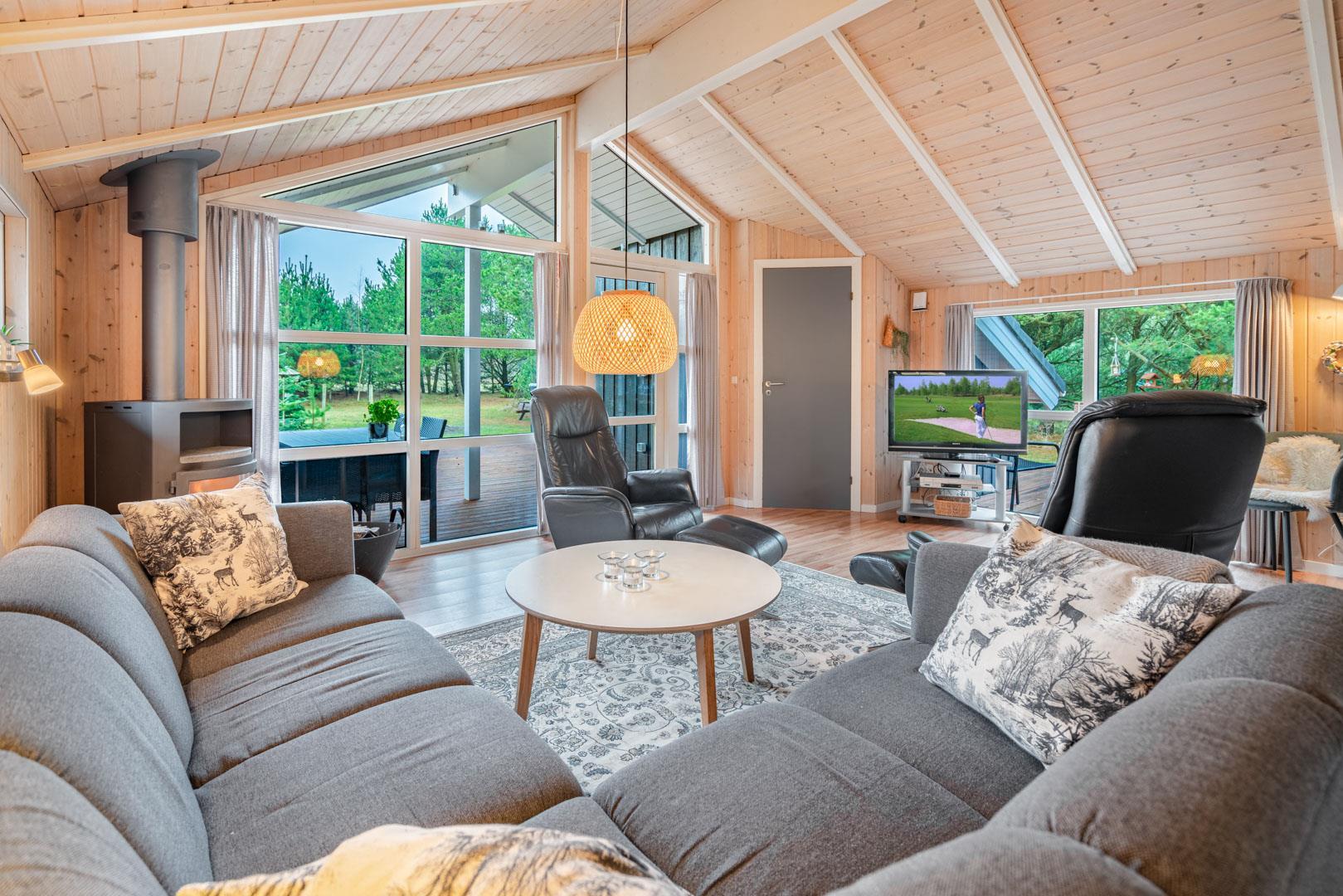 Die Farben der Natur bilden eine schöne Kulisse für den Familientreffpunkt im Wohnzimmer, wo sich eine Fensterfront vom Boden bis zur Decke erstreckt, und die weichen Sofas laden zu langen Gesprächen am gemütlichen Feuerschein des Ofens ein. Wenn Sie während der Sommersaison hier sind, können Sie die Terrassentür weit offen lassen, um einen natürlichen Übergang zur Außenterrasse zu schaffen. Auf diese Weise haben Sie auch einfachen Zugang zu einem kalten Getränk aus einem der beiden Kühlschränke des Hauses oder zu einem Eis im Gefrierschrank. Das Haus verfügt über eine 1000/1000 MB Internet-Verbindung.