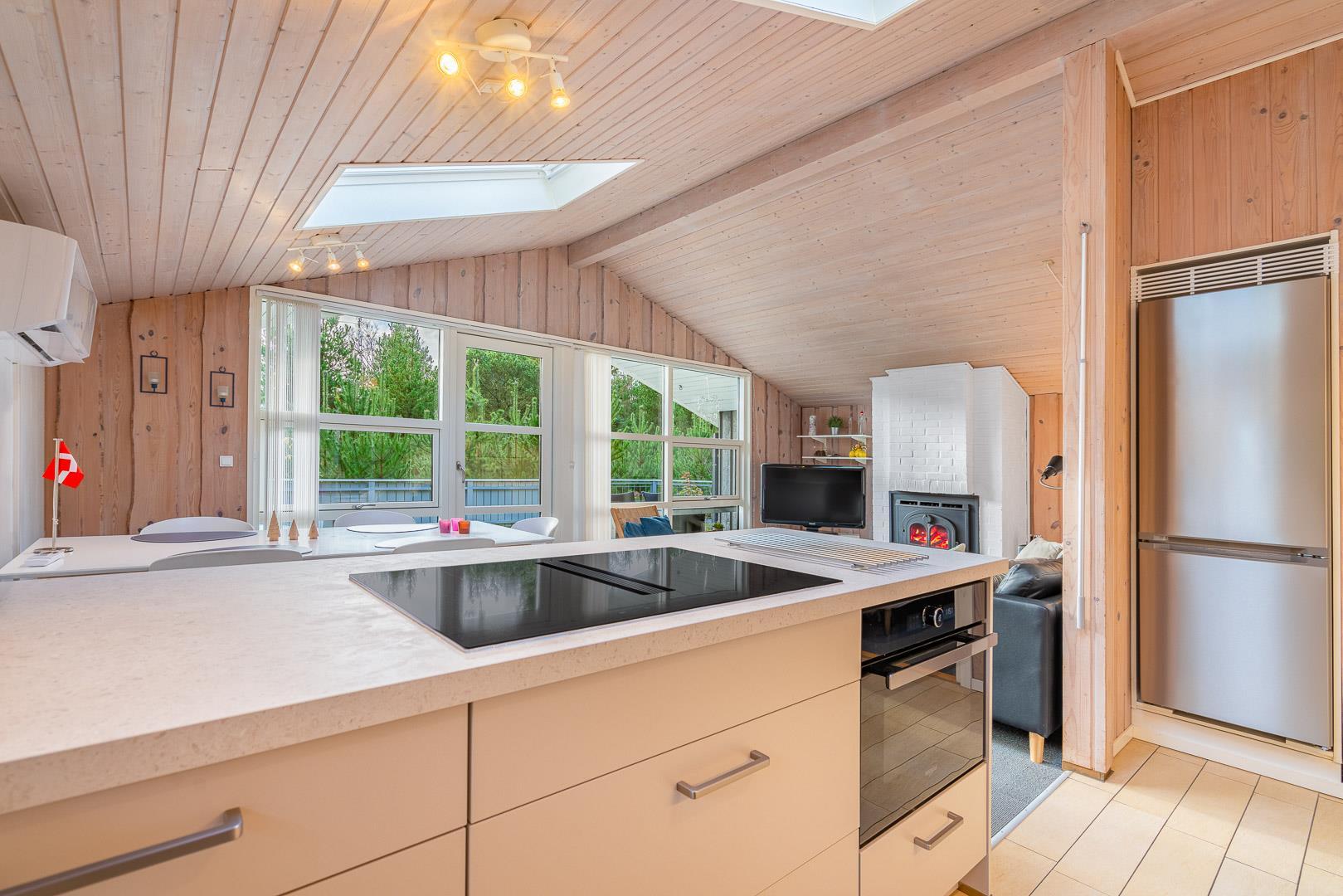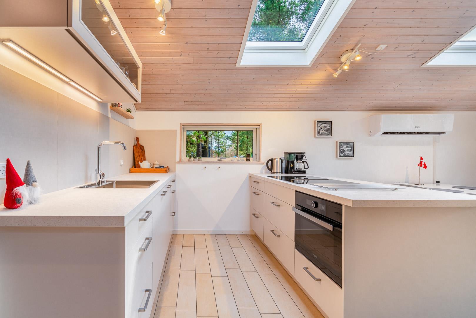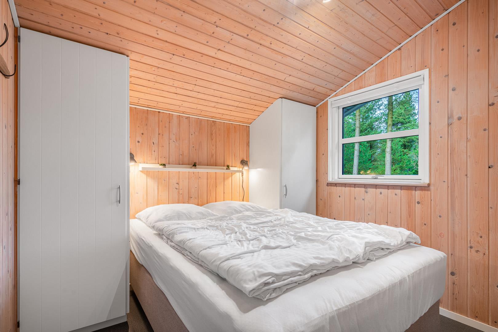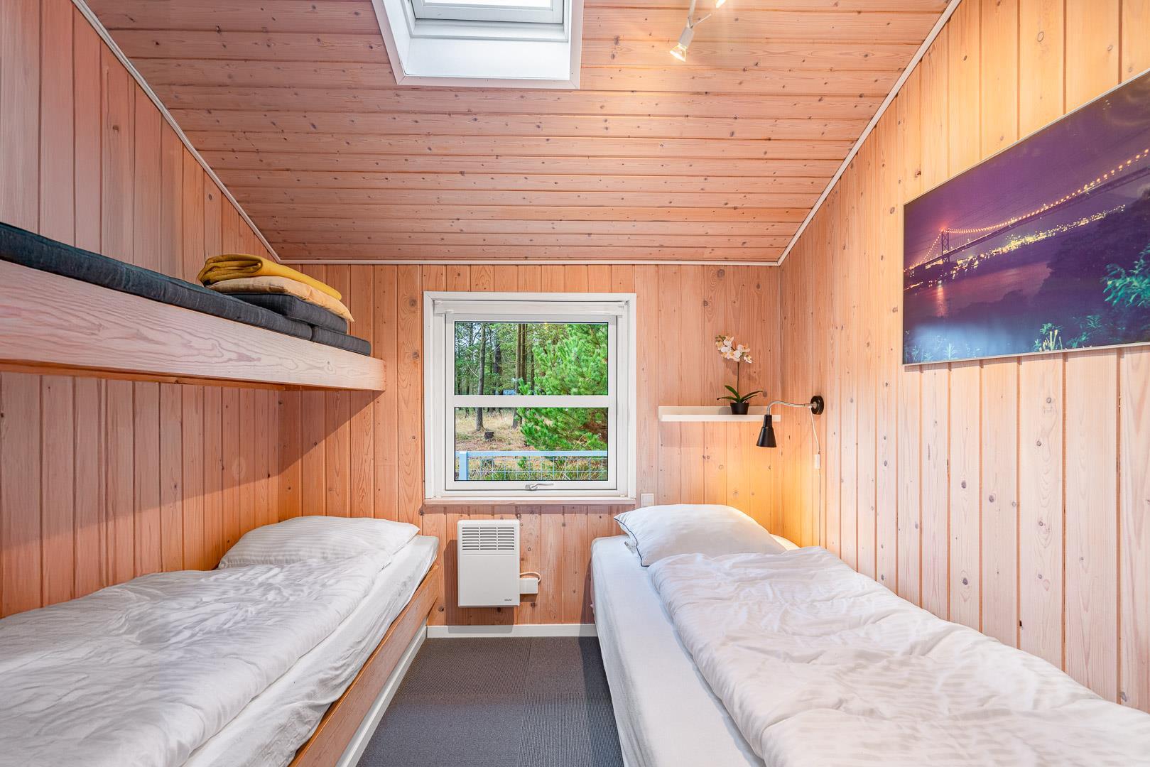 Im Inneren des Hauses sorgen große Fensterflächen und Dachfenster den ganzen Tag über für wunderbares Licht. Es bietet Platz für 4 Personen, verteilt auf ein Schlafzimmer mit Doppelbett (140 x 200 cm) und ein Zimmer mit zwei Einzelbetten (90 x 200 cm, eines davon als Ausziehbett) – ideal für die Kinder.
