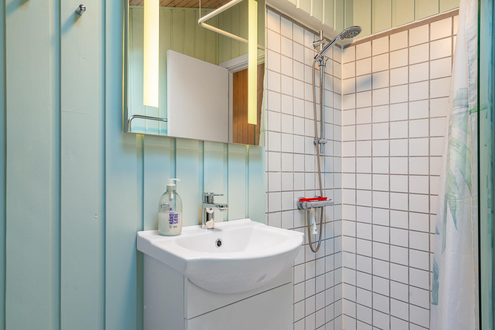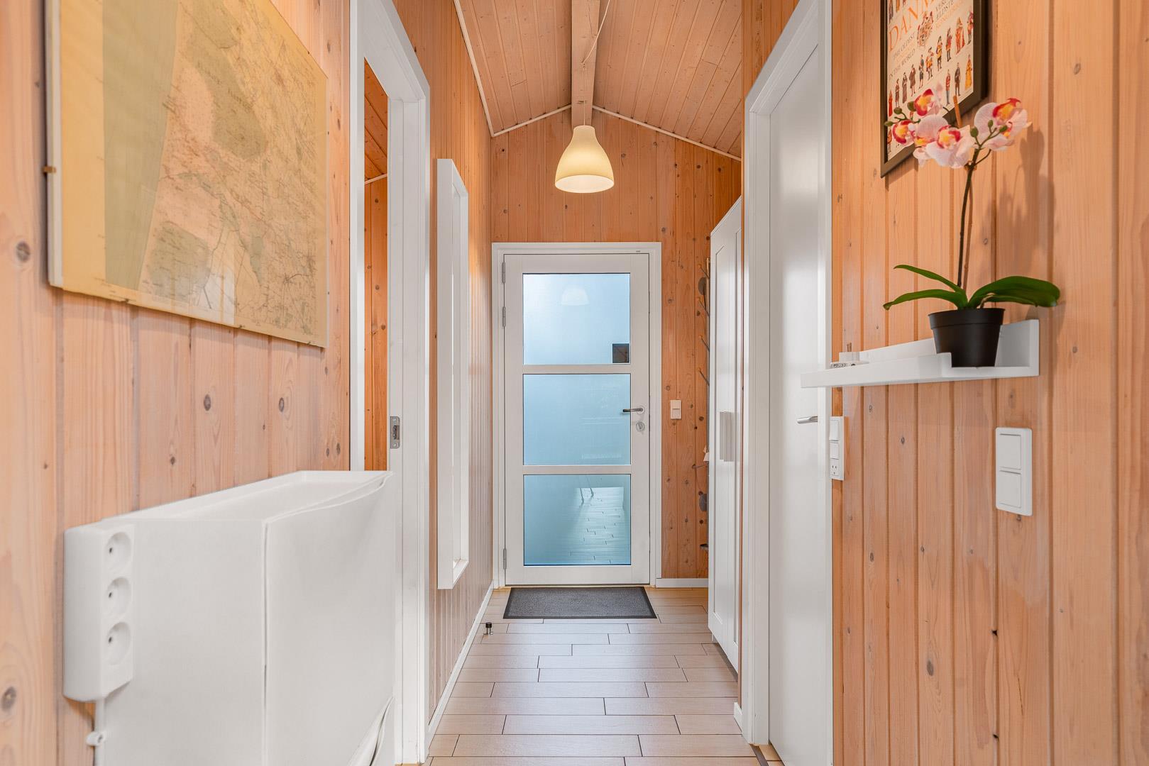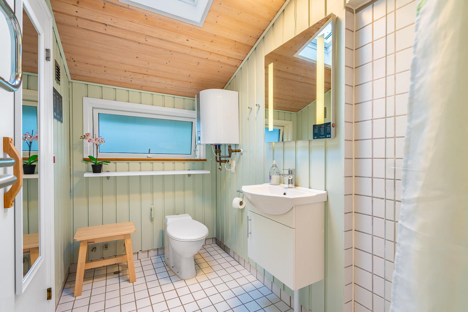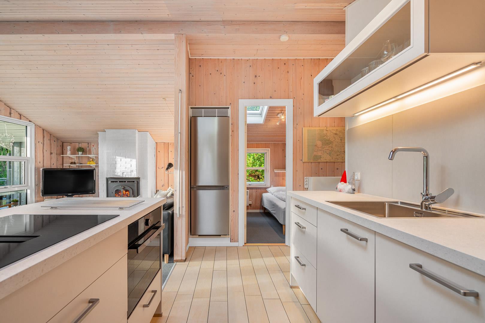 Im Inneren des Hauses sorgen große Fensterflächen und Dachfenster den ganzen Tag über für wunderbares Licht. Es bietet Platz für 4 Personen, verteilt auf ein Schlafzimmer mit Doppelbett (140 x 200 cm) und ein Zimmer mit zwei Einzelbetten (90 x 200 cm, eines davon als Ausziehbett) – ideal für die Kinder.