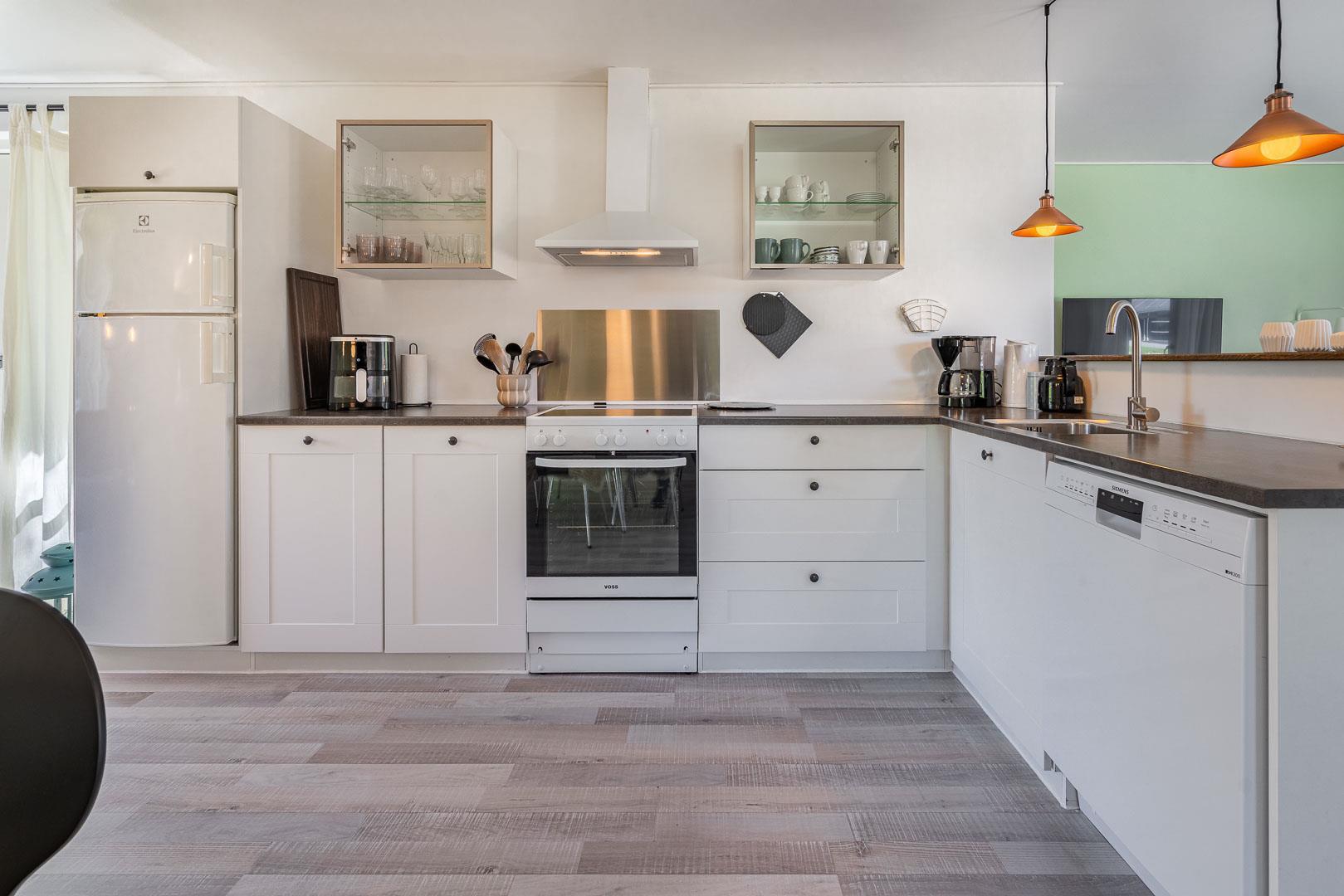 Das offene, moderne Küchen-/Wohnkonzept mit Geschirrspüler, separatem Gefrierschrank und gemütlichem Wohnbereich mit Kamin sorgt für eine warme, einladende Atmosphäre. WLAN, Chromecast-TV und eine energiesparende Wärmepumpe sind selbstverständlich vorhanden. Auch Waschmaschine und Trockner stehen bereit – praktisch für längere Aufenthalte.