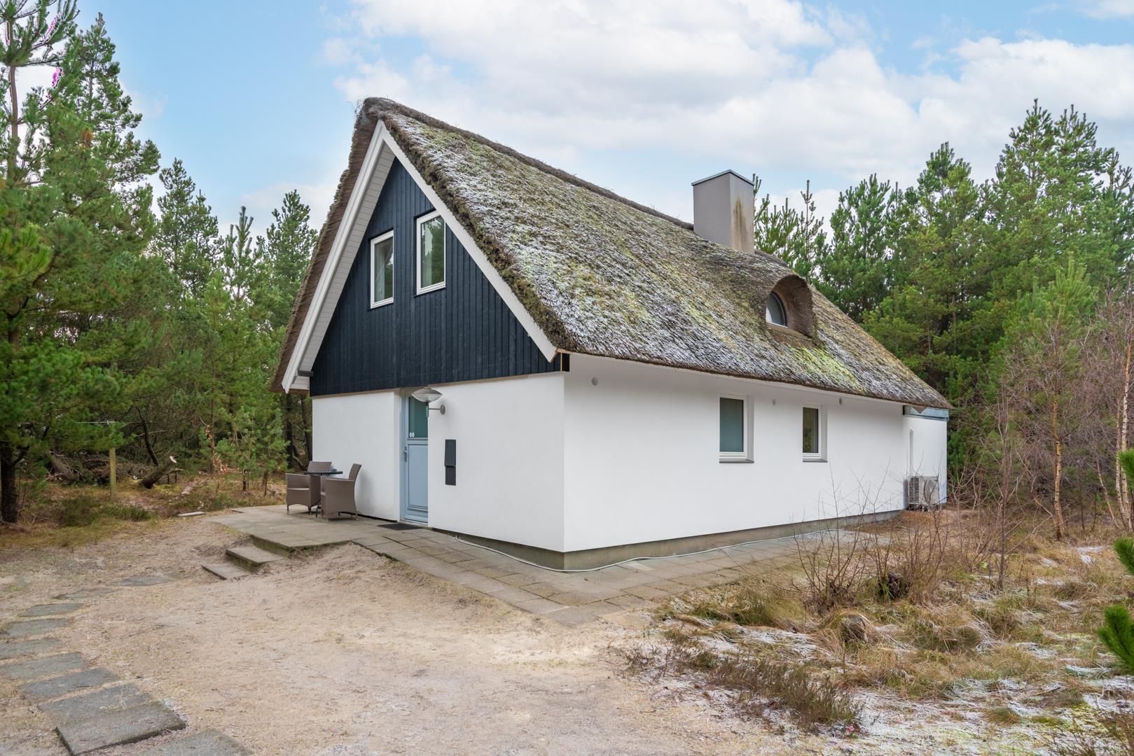 Das Ferienhaus liegt auf einem schönen Naturgrundstück, umgeben von Bäumen typischer Heidelandschaft – hier genießt du Ruhe, Privatsphäre und frische Nordseeluft.
