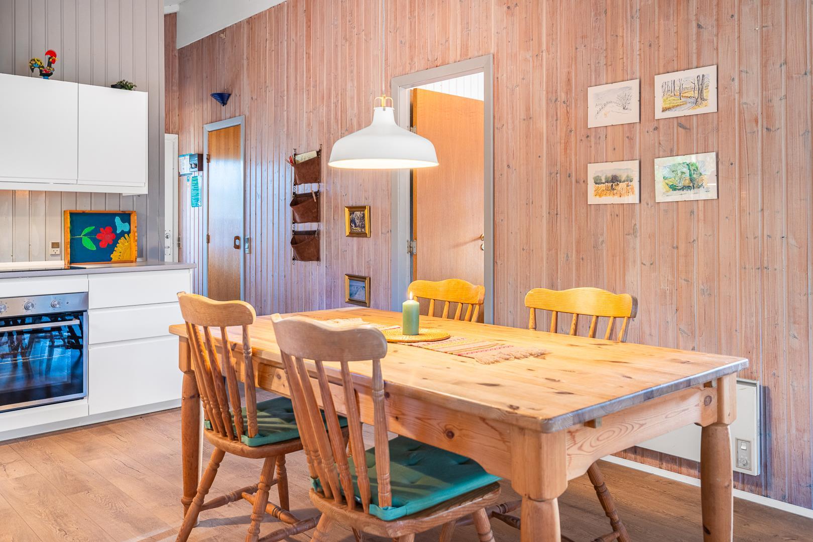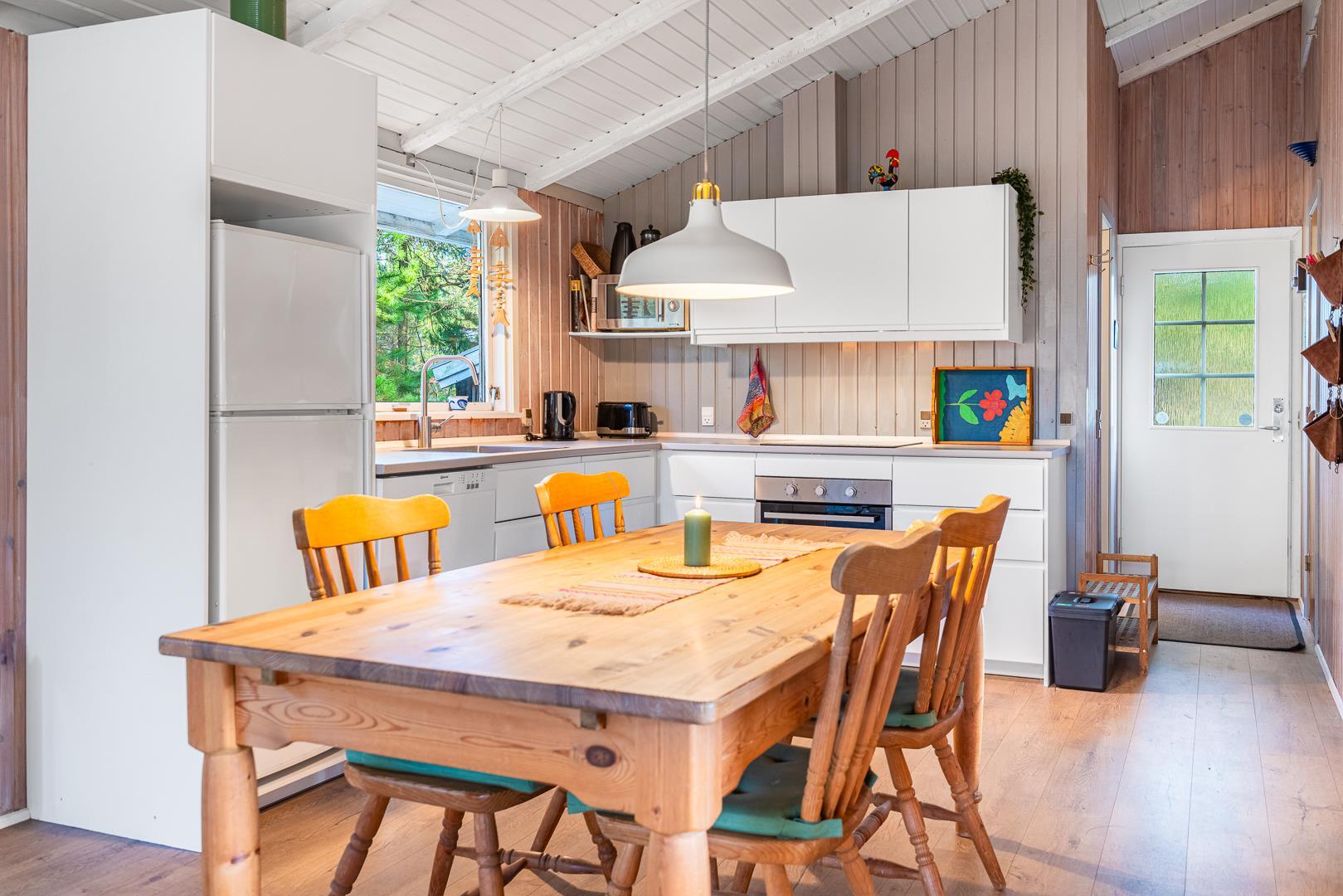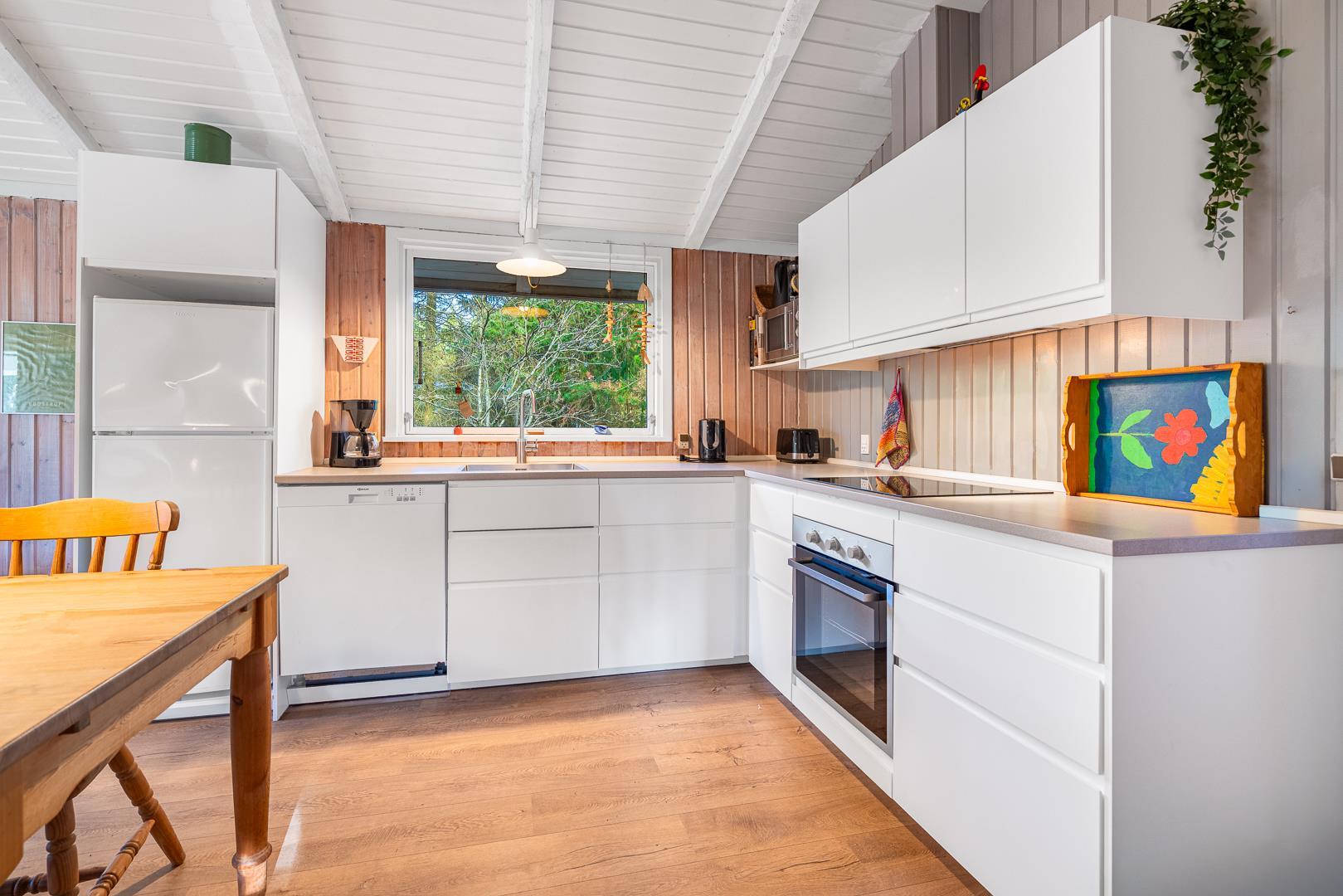 Im Wohnbereich des Ferienhauses im Højsvej 37 lädt ein Kamin zu gemütlichen Abenden ein. Hier könnt ihr nach einem Tag am Strand oder einer Wanderung durch die schöne Landschaft entspannen, ein Buch lesen oder gemeinsame Spieleabende genießen. Der offene Schnitt sorgt für eine freundliche, einladende Atmosphäre und die moderne Küche ist mit einer Spülmaschine ausgestattet, welche euch den Alltag erleichtert. Zaubert eure Lieblingsgerichte – ganz flexibel und unabhängig.