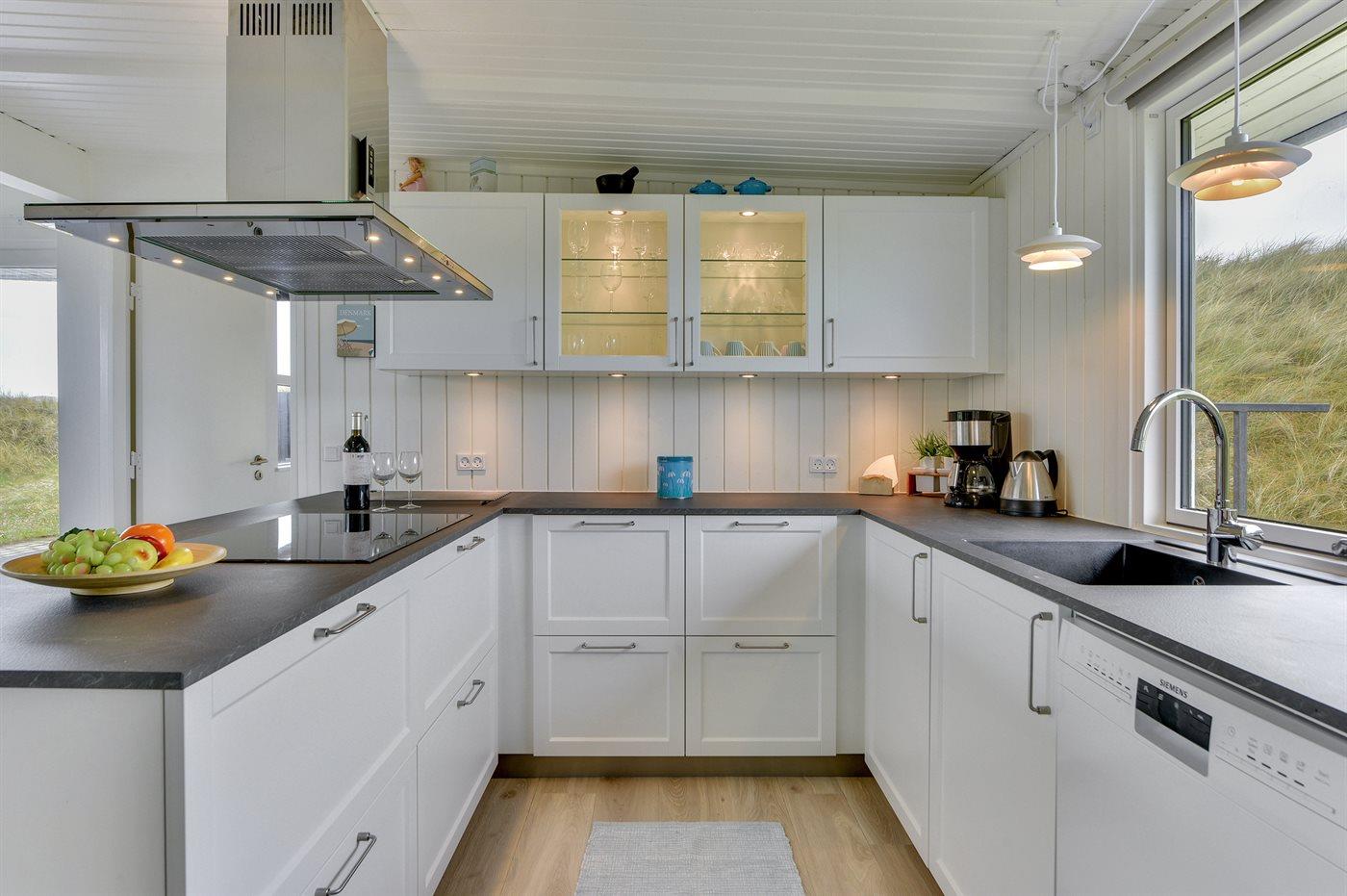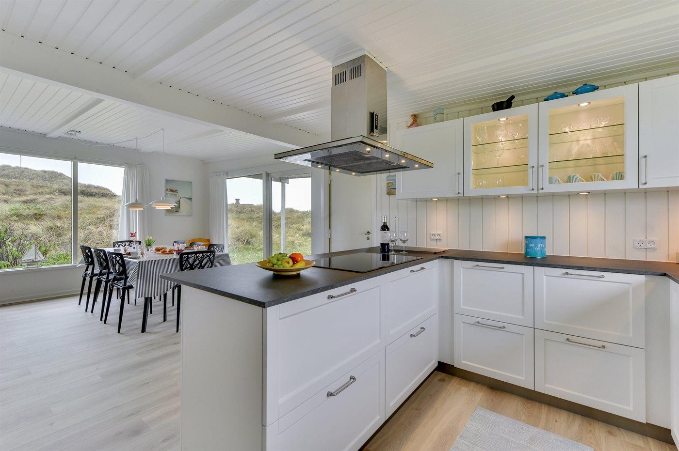 Die Küche ist mit Kühlschrank ausgestattet. Außerdem gibt es 4 Induktions-Kochzonen, Umluftofen, Mikrowelle sowie Geschirrspüler.