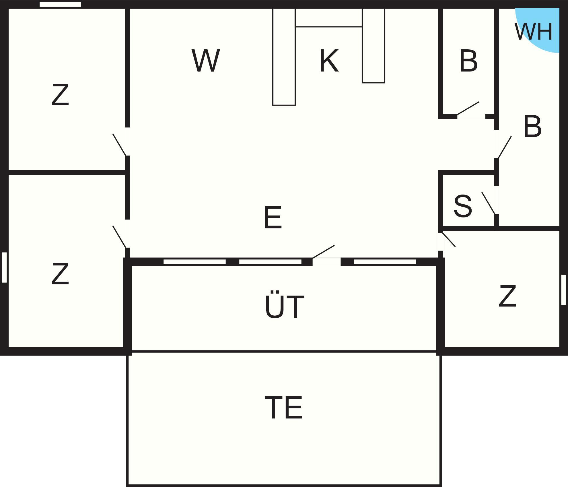Off. Küche: E-Herd, Kühlschr. m. Gefrierfach, Mikrow., Abzugsh., Kaffeem., Spülm., Waschm, Trockner