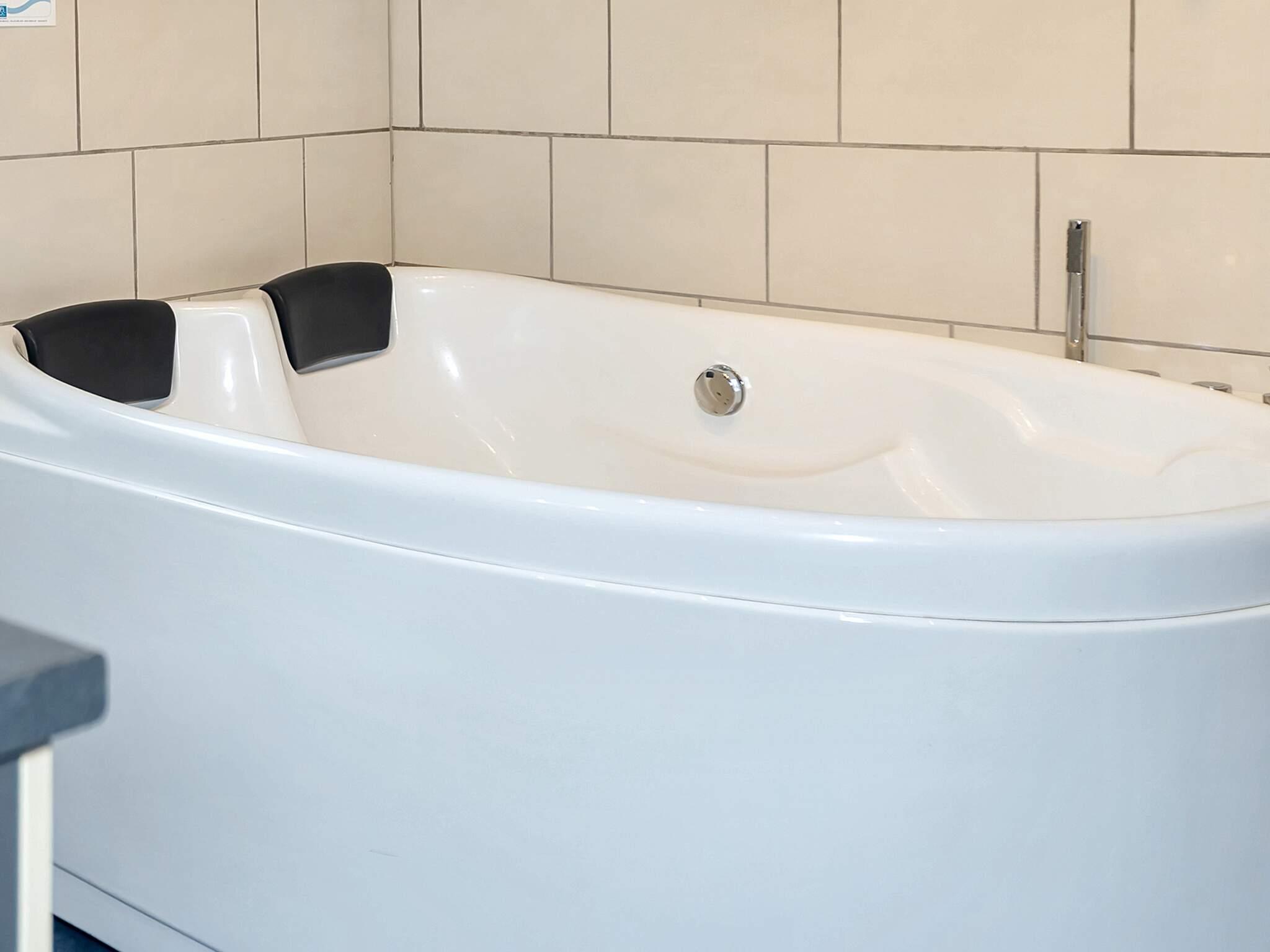 Das helle und moderne Badezimmer verfügt über eine Whirlpool-Badewanne für 2 Personen, eine Badewanne, eine Dusche, ein WC und Fußbodenheizung.