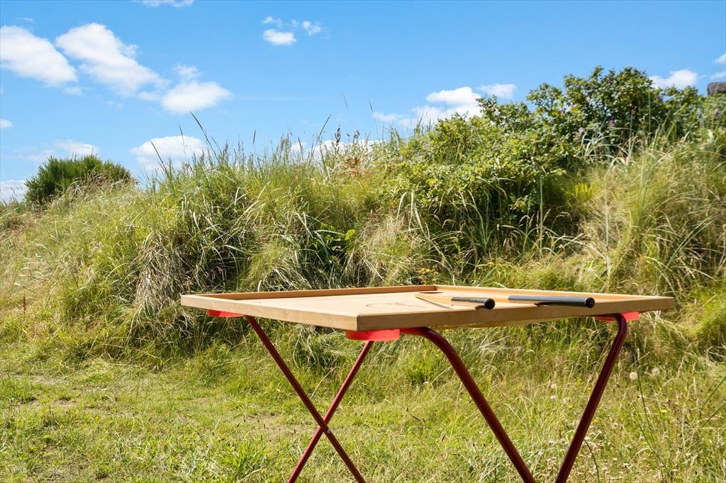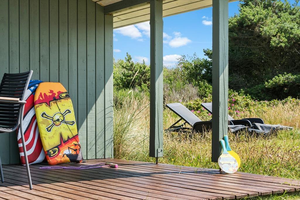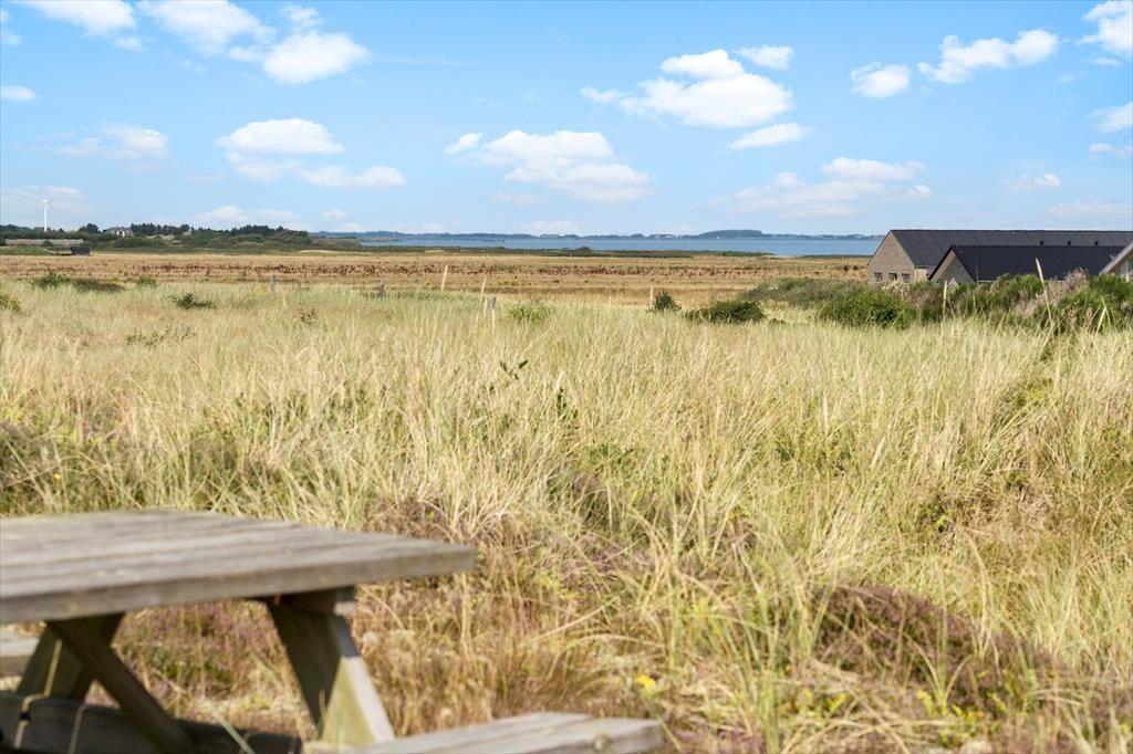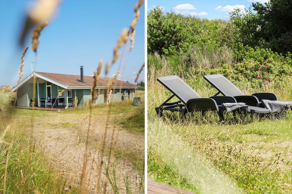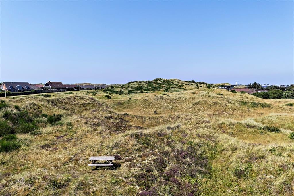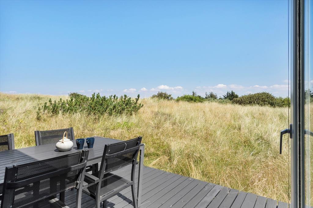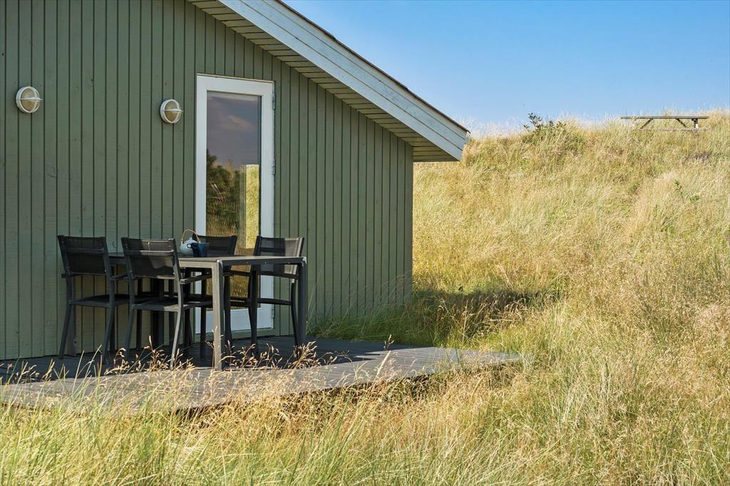 Eine Morgenterrasse befindet sich östlich des Hauses. Später am Tag ist es angenehm, sich auf der teilweise überdachten Terrasse gen Westen aufzuhalten. Auf dem hügeligen Dünengrundstück finden sich mehrere windgeschützte Bereiche. Wenn Sie auf die Düne hinaufsteigen, können Sie sich dort auf die Bank setzen, um die Aussicht über Holmsland Klit und den Ringkøbing Fjord zu genießen.