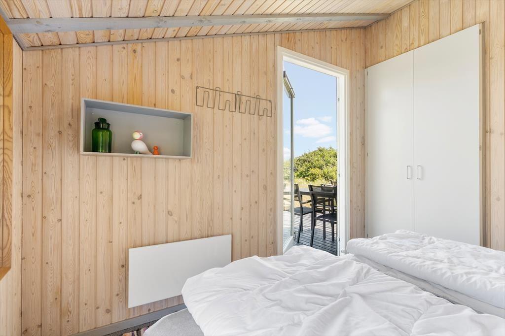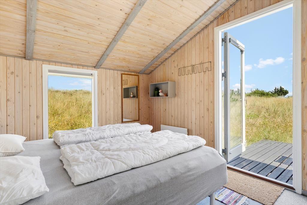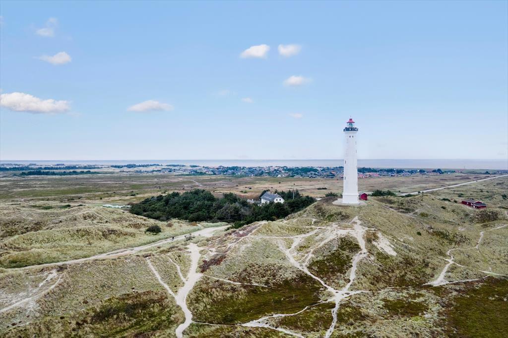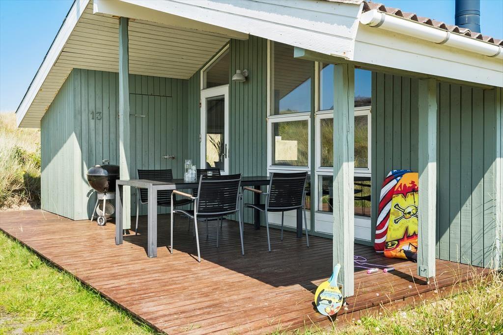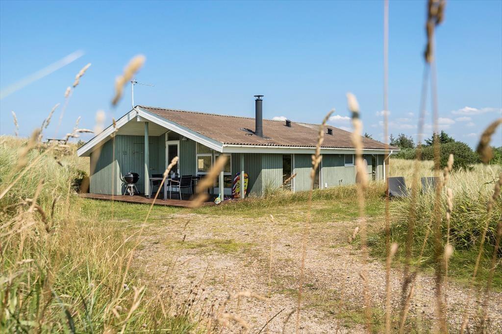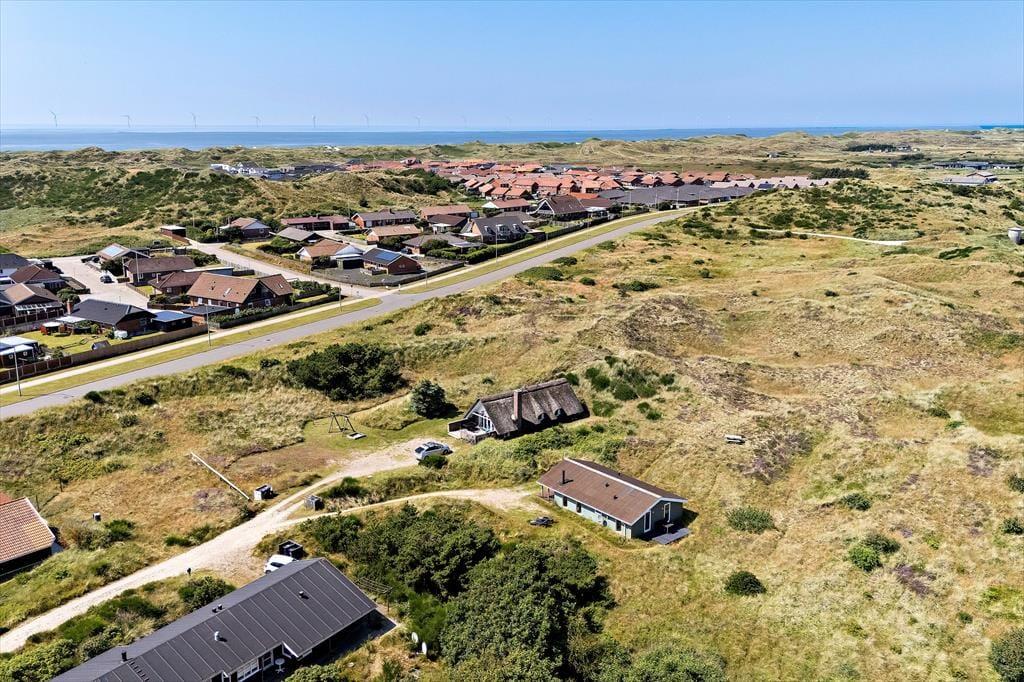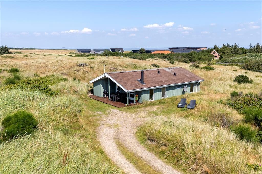 Eine Morgenterrasse befindet sich östlich des Hauses. Später am Tag ist es angenehm, sich auf der teilweise überdachten Terrasse gen Westen aufzuhalten. Auf dem hügeligen Dünengrundstück finden sich mehrere windgeschützte Bereiche. Wenn Sie auf die Düne hinaufsteigen, können Sie sich dort auf die Bank setzen, um die Aussicht über Holmsland Klit und den Ringkøbing Fjord zu genießen.