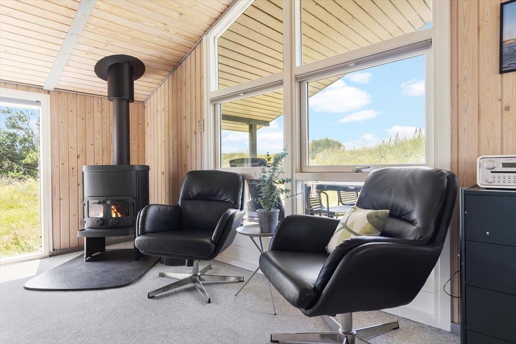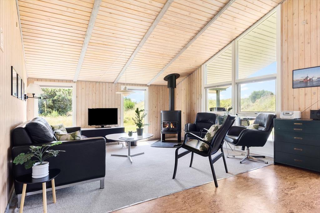 Das Ferienhaus hat einen kombinierten Küchen- und Wohnbereich mit hohen Decken und einer hellen Holzverkleidung, die dem Raum ein angenehmes Raumgefühl verleiht. Hier steht neben behaglichen Möbeln auch ein Kamin, sodass der Raum zu einem gemütlichen Abend mit Spielen, guten Büchern und leckerem Essen förmlich einlädt.