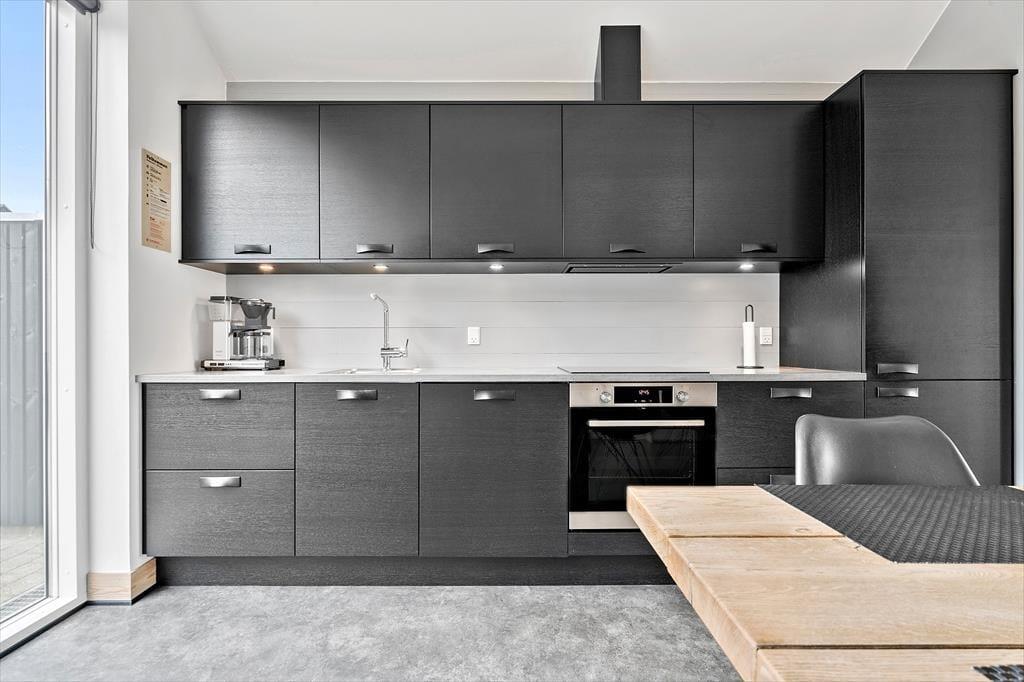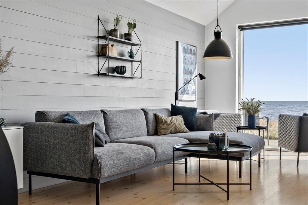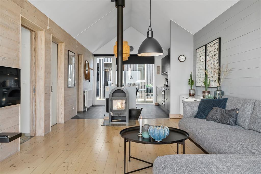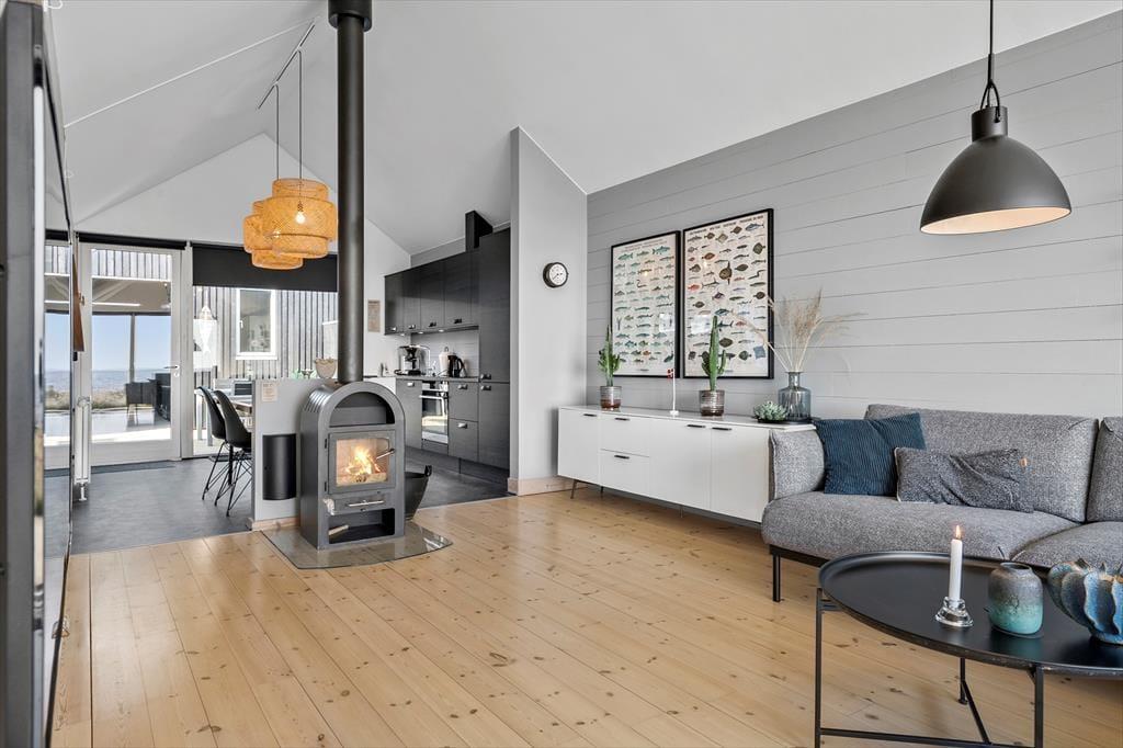 Das Ferienhaus hat zwei Schlafzimmer, die zusammen vier Personen einen Schlafplatz bieten. Außerdem gibt es zwei Bäder, eines mit Dusche und Sauna, das andere mit Whirlpool. Im Wohnbereich sind Küche und Wohnzimmer zu einem großen Raum zusammengefasst, und die hohe Decke und die großen Fenster sorgen für eine helle und luftige Atmosphäre in Ihrem Urlaub. Die Küche ist auch für die anspruchsvollsten Gerichte gut ausgestattet, und die Mahlzeiten können problemlos am Esstisch serviert werden, während die Spülmaschine die Reinigung übernimmt. Das Sofa bietet einen Blick auf den Fjord und der Holzofen sorgt für Gemütlichkeit an dunklen Abenden, während WLAN und der Fernseher für Unterhaltung sorgen.