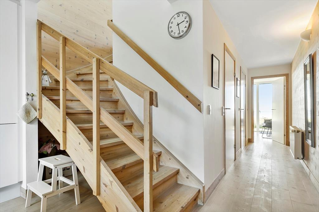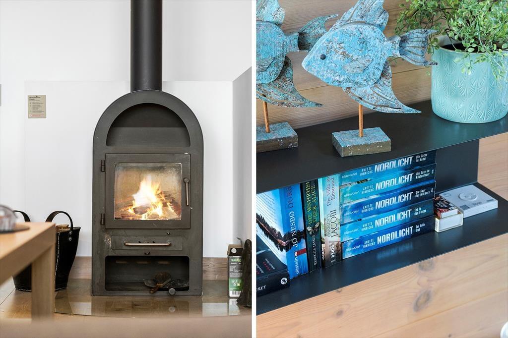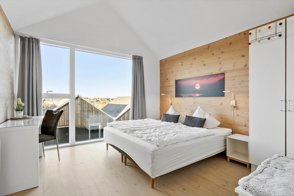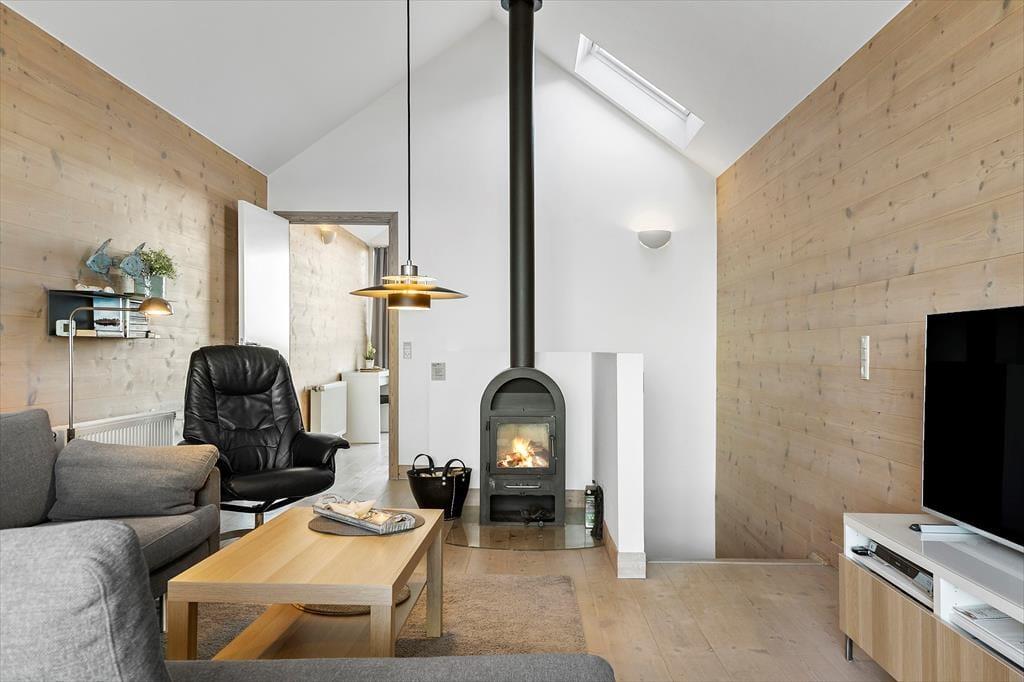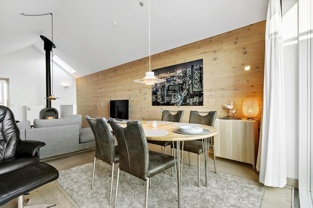 Das 116 m² große Reihenhaus überzeugt nicht nur mit guten Qualitätsmaterialien, sondern auch mit einer richtig liebevollen Einrichtung. Dies erkennen Sie unter anderem in der gut ausgestatteten Küche im Erdgeschoss und im Obergeschoss, wo Sie auf einen zusätzlichen Essplatz, komfortable Polstermöbel und einen Kaminofen treffen. Für Unterhaltung sorgt ein großer Flachbild-TV. Diesen werden Sie dank des großen Panoramafensters und des tollen Fjordblicks sicherlich nicht allzu oft nutzen. Nicht weniger schön ist der Ausblick im Schlafraum des Erdgeschosses. Der im Obergeschoss platzierte Schlafraum bietet Ihnen eine Aussicht über die Hausdächer im Norden. Im Haus gibt es 2 Badezimmer, die 2024 neu renoviert wurden und über einen großen Duschbereich verfügen. Das Nebengebäude beherbergt einen Hauswirtschaftsraum, wo Ihnen eine Waschmaschine, ein Wäschetrockner, ein Tiefkühler und ein Fischreinigungsplatz zur Verfügung stehen.