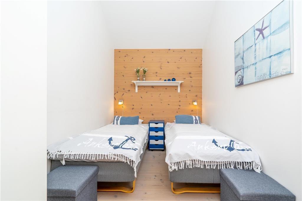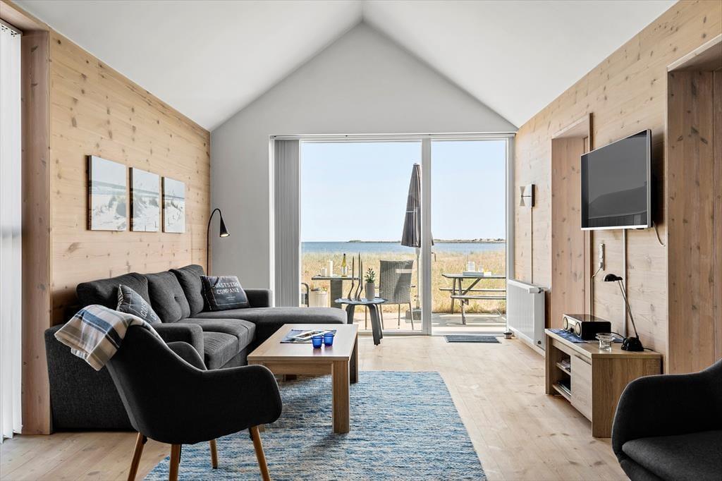 Während gemütlicher Stunden im Wohnraum werden Sie mit einem Ausblick über die Fjordwiesen und das Wasser verwöhnt. Die Aussicht bewundern Sie auch von einem der drei Schlafzimmer des Reihenhauses aus. Sie genießen somit das wunderbare Gefühl, ganz nah am Wasser zu wohnen. Das Hausinnere ist gleichermaßen ansehnlich. Sie verbringen Ihre Urlaubstage in einem gut aufgeteilten Qualitätshaus, das mit modernem Interieur und komfortablen Wohnlösungen zu überzeugen weiß. Der Wohnraum, in dem ein großem 43" Smart-TV und ein Kaminofen für Unterhaltung und Stimmung sorgen, ist offen mit der tollen Küche verbunden. Eines der Badezimmer überzeugt mit einem Whirlpool, das andere mit einer Sauna. Vom Hinterhof gelangen Sie in einen Hauswirtschaftsraum, in dem eine Waschmaschine, ein Wäschetrockner und eine Gefriertruhe zu Ihrer Verfügung stehen.